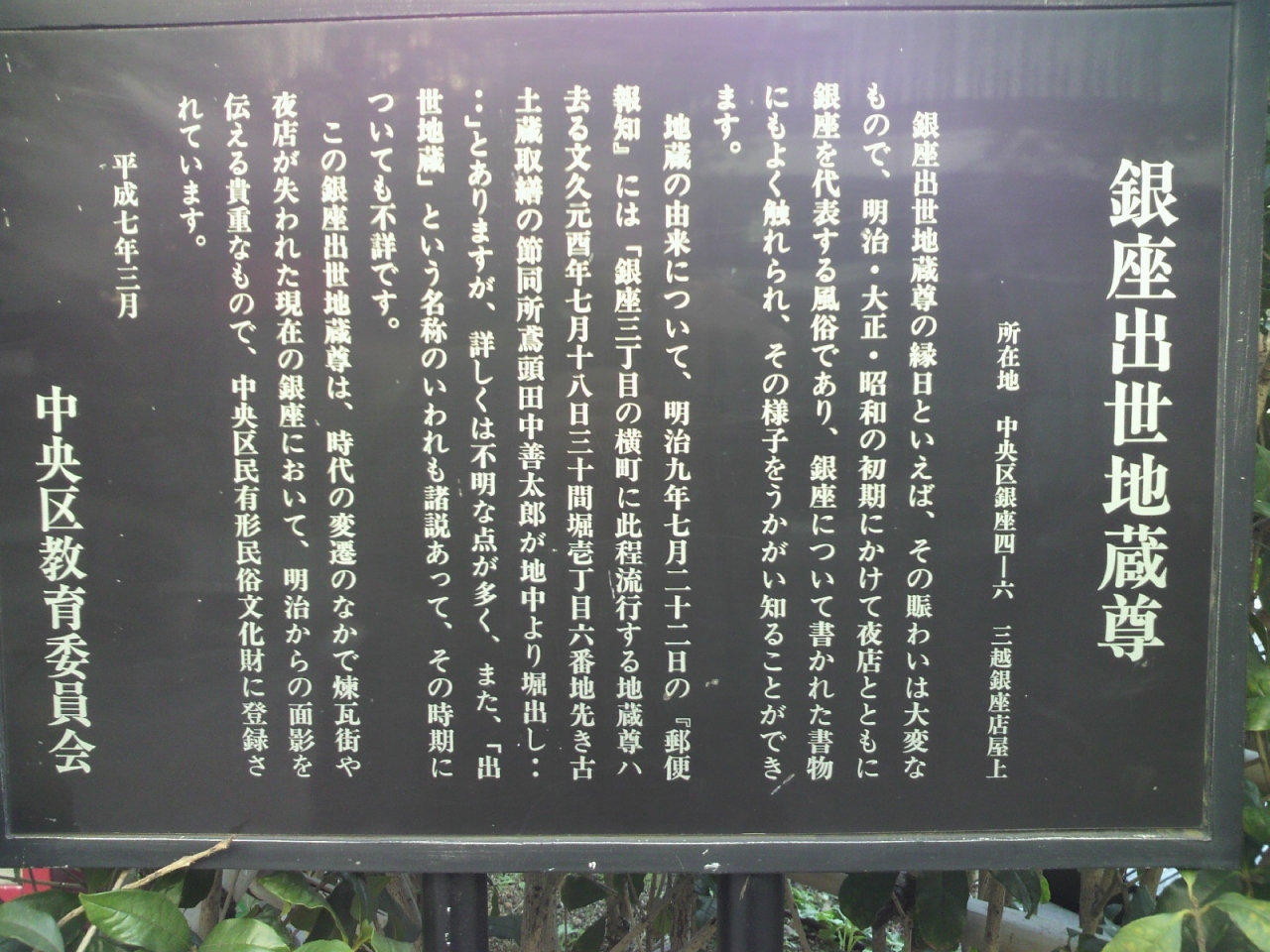 銀座出世地蔵尊は、明治のはじめ頃、現在の銀座三原橋辺りを流れていた三十間堀川の工事中に発見されたといわれるお地蔵さまです。