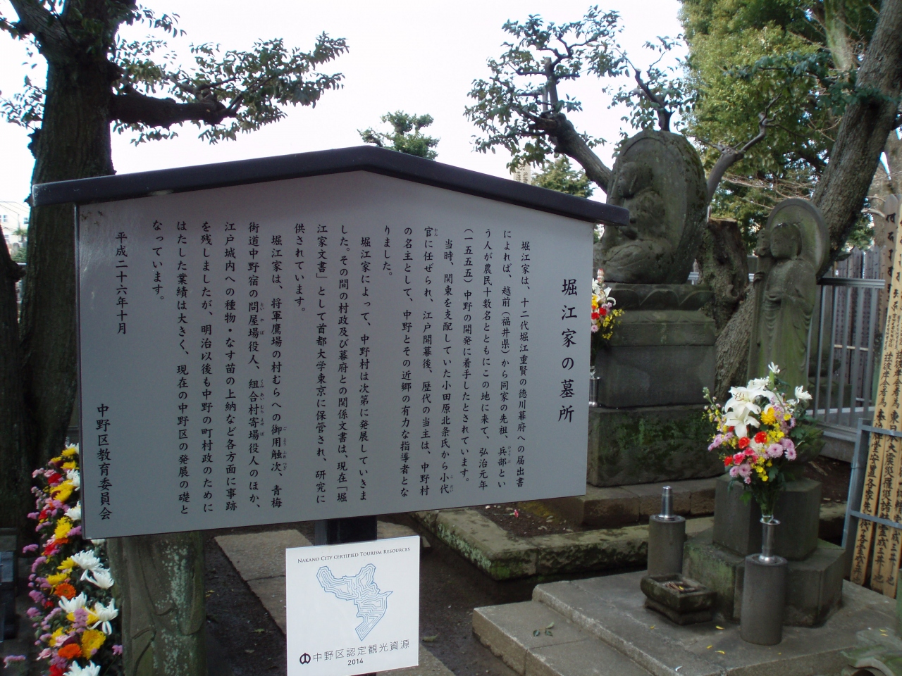 東京メトロ中野坂上駅から青梅街道を左折すると平安時代創建の古い歴史ある宝仙寺に歩いて5分ぐらいで着きます。宝仙寺の見事な仁王門をくぐると広い境内の奥に堀江家墓所と案内板あります。案内板によれば堀江家は将軍鷹場の村むらへの御用触次、青梅街道中野宿の問屋場役人として江戸城内への種物の上納などで事跡を残し、現在の中野区の発展の礎となっています。ホリエモンとは無関係です~