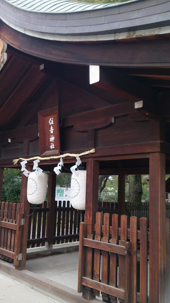 谷町九丁目駅からほど近い、大阪でも有数の寺町である、生玉、谷町、高津エリアにある有名な神社の生國魂神社の広い境内の一画にあります。末社や石碑、銅像などが集まっている場所にあって、お隣の天満宮と同じような建物です。社自体はかなりコンパクトなもので、その手前に木柵に囲まれた木造の上屋のような建物があります。有名な大阪・住吉区の住吉大社との関係は分かりません。こちらの神社は航海の安全、海路平安の神様として信仰されています。特徴のあるお社ではなく、ここを主目的で訪問するかどうかとなると微妙です。