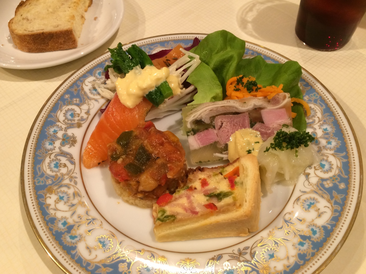 たっぷりの種類豊富な前菜とメイン、スープ、パン、コーヒー(または紅茶)で1500円。