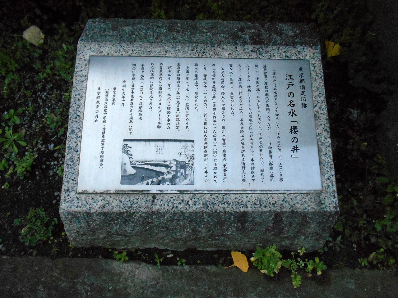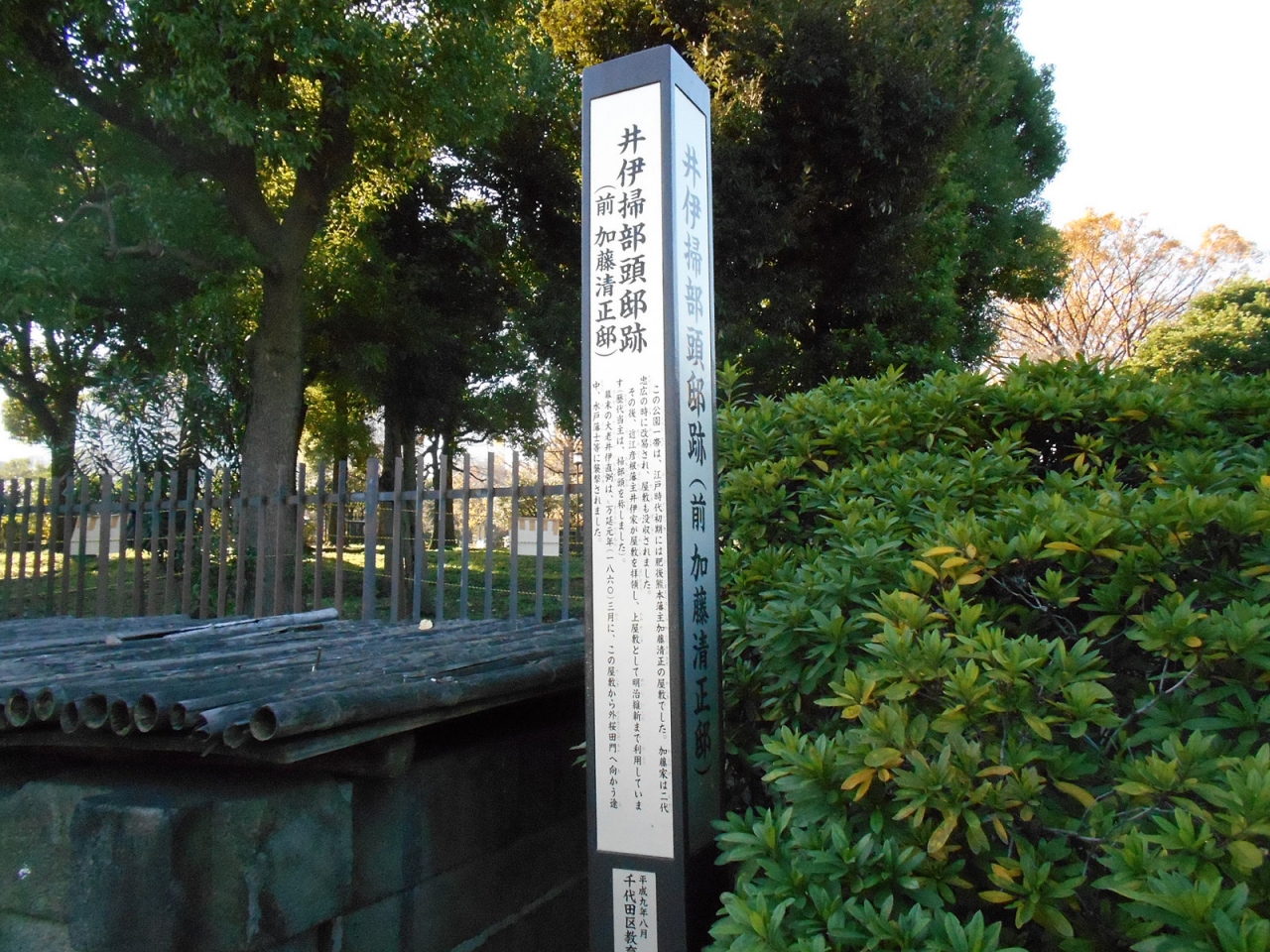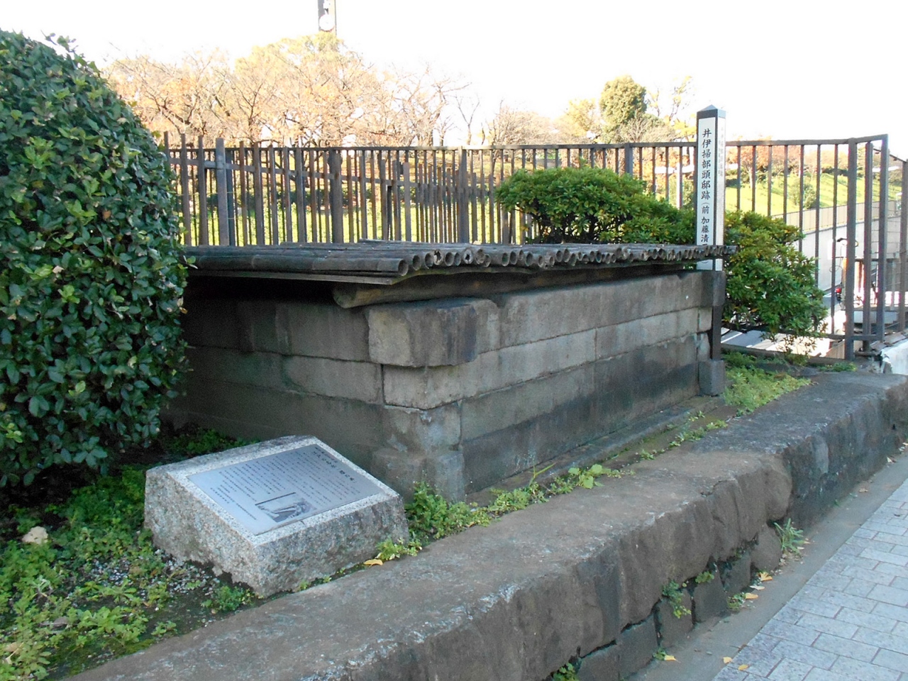 三宅坂交差点から地下鉄「桜田門」駅に向かって散歩していた時、偶然に見つけた史跡です。案内プレートには、この井戸は、この地に屋敷を構えていた加藤清正が掘ったと伝えられるもので、江戸を代表する名水として、なんと安藤広重『東都名所』にも描かれたほどであったとありました。後に井伊家の屋敷になり、大老井伊直弼がこの井戸の辺りから「桜田門」に向かう途中に暗殺されたとのこと。歴史を身近に感じられました。ちなみに私も井伊さんと同じように「桜田門」に向かいましたが、まだ何とか生きています。