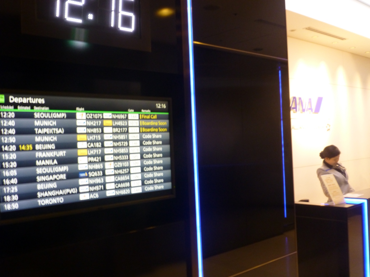 今回はNH853(台湾行,12:40出発時間)で利用しました。11:00頃で混んでいました…テーブル椅子は満杯でPC用机の椅子も空いているのは僅かでした。いつも`かき揚げうどん`(飛行機でもランチが出るのですが、このラウンジに来ると`うどん`を頼みます(^^) を頼む間にPCの準備をしました。うどん/ほうじ茶を食べて、メールのやり取りを済ますともう出発ですネ。ラウンジ受付で`のど飴`(その昔はラウンジ中に有ったのですが,,)を貰ってゲート迄行きます。