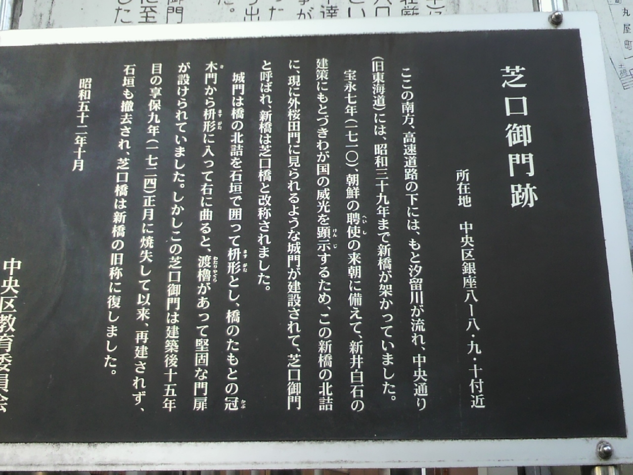 朝鮮通信使の江戸来訪に際し、新井白石は、接遇のための門を新橋の北に造ることを献策し、芝口御門が建設されました。