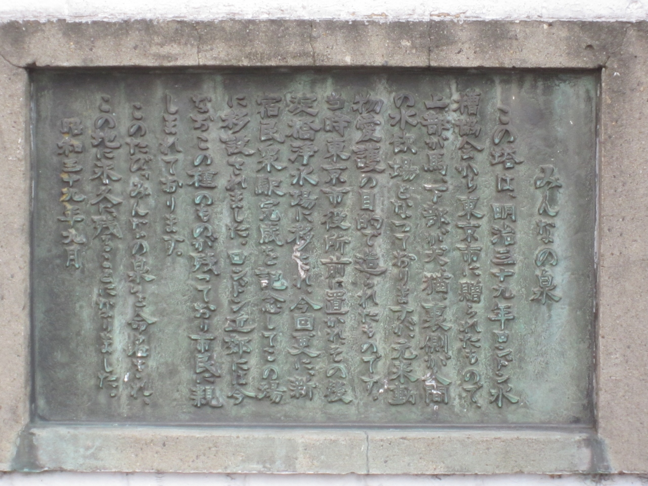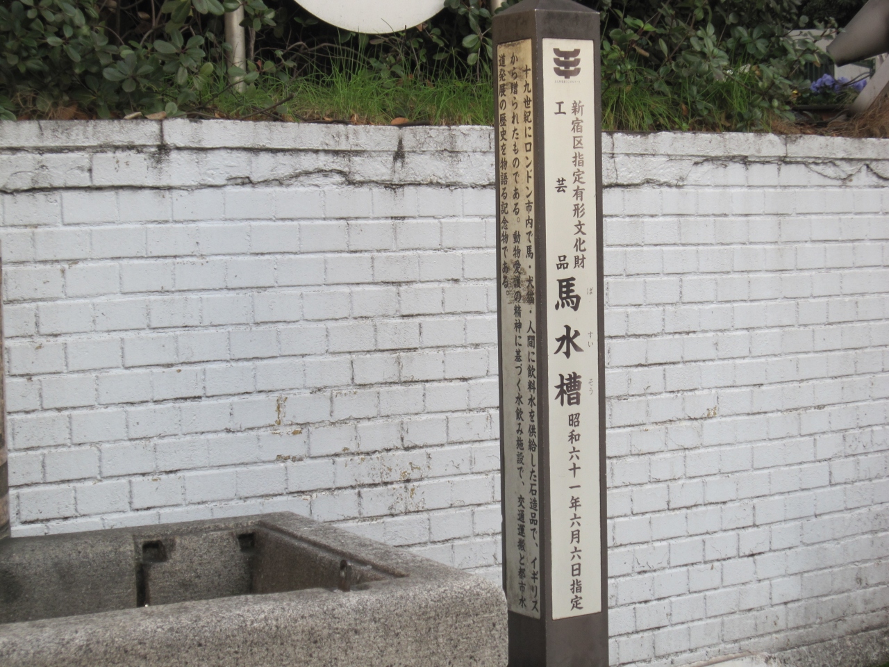 新宿区指定有形文化財で19世紀にロンドン市内で馬、犬猫、人間に飲料水を供給した石造品でイギリスから贈られ貴重な物のようです。何箇所が移り今ある所は新宿民衆駅完成を記念して移設し「みんなの泉」と命名し永久に残すことになったそうです。設置場所は新宿駅東口アルタ側です。今は柵で囲まれ近づくことは出来ませんでしたが、関心を持ち見向きをする人はいませんでした。