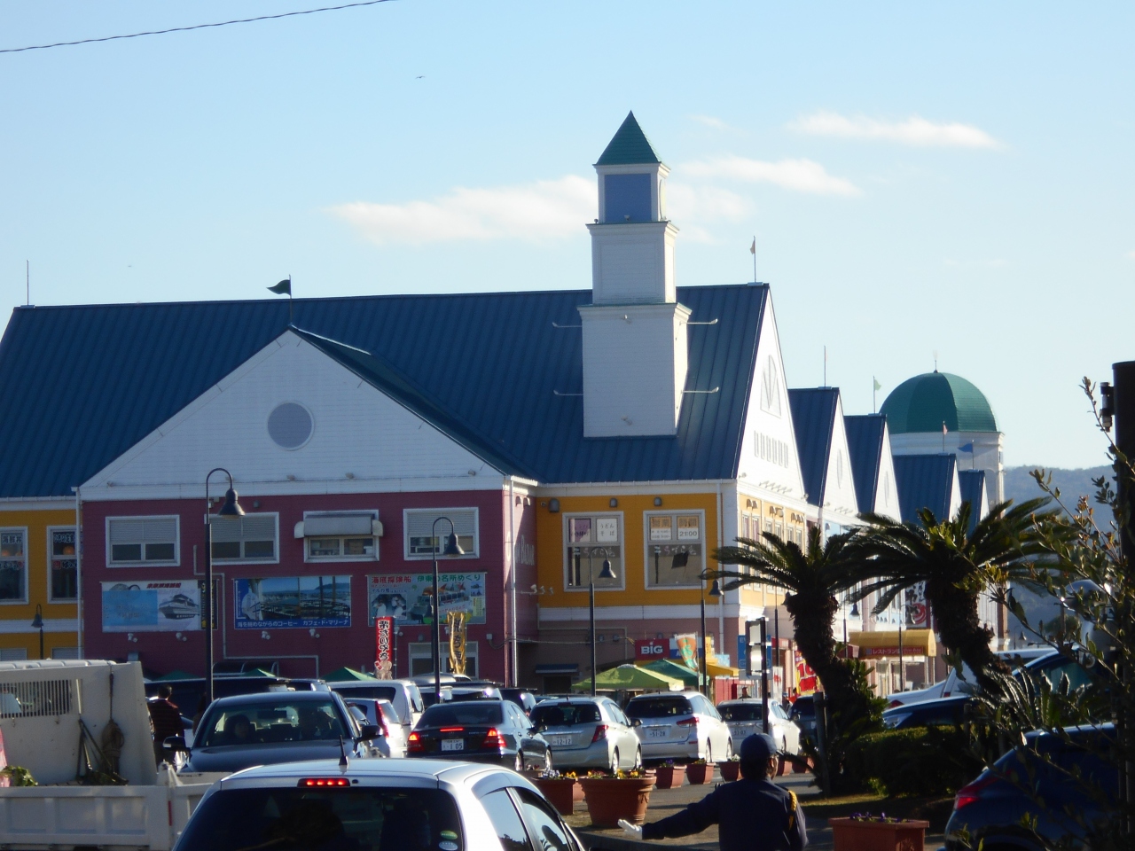 カラフルな色の建物が特徴的で、1階にはお土産店が並び、海の幸が味わえるレストランもあります。