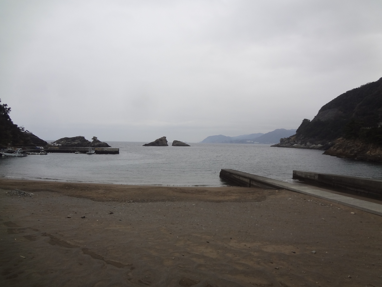西伊豆の静かな港町です。小さいながら夏は海水浴場としても賑わいます。宿泊施設は民宿が大半を占めており、昔ながらの雰囲気を今に残しているのが印象的でした。訪れた冬場はひっそりとしていて、当然ながら浜には誰もいませんでした。海はとてもきれいで、沖にはふたつの岩がそびえていて、景観としても風情がありました。