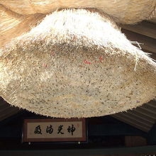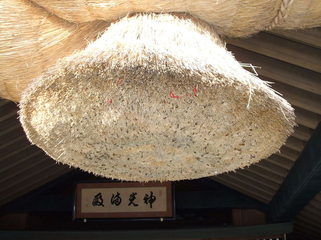 出雲大社にお参り後、隣にある神楽殿にもお参りに行きました。ここには大きな太いしめ縄がありお願いをしてコインを下からしめ縄めがけて投げて刺さったら願いが叶うということで試しました。意外に難しいです。多くの人が投げているので頭上に注意が必要です