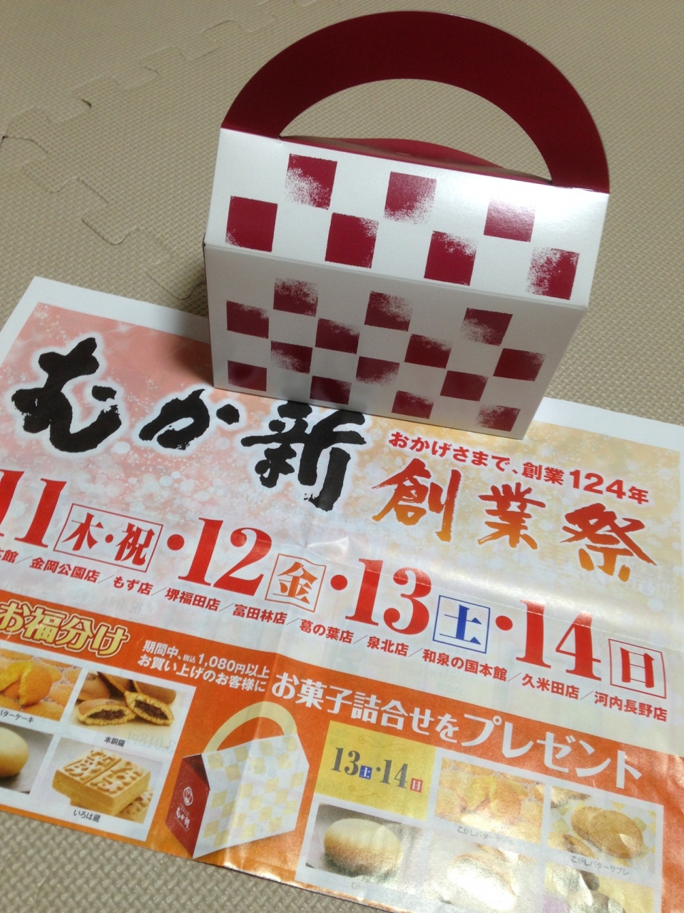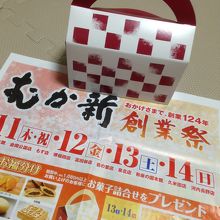 新聞の折り込み広告でみつけてお菓子を買いに行きました。2月11日~14日は創業祭をしており。1080円以上のお買い物をすると、同社のお菓子5点の詰め合わせが頂けます。かなりお得だと思います。毎年恒例のようなのでまた来年狙います。