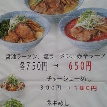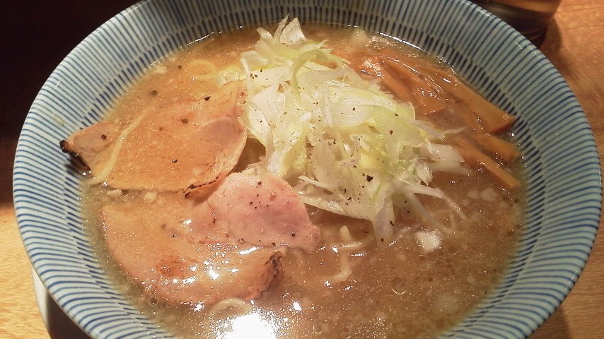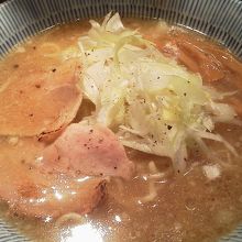 薄切りチャーシューが2枚は片面のみガスバーナーで炙り、やや多め千切り葱、メンマと比較的シンプル。