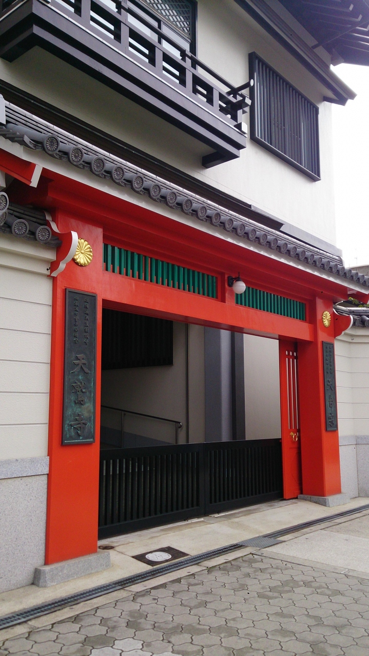 市営地下鉄の四天王寺前夕陽ヶ丘駅の1番出口を地上に上がるとすぐ横がこの寺院になります。寺町であるこの界隈を散策していても、谷町筋を通っていても朱色の山門と建物の最上部朱色の塔が非常に目立っています。建物自体は現代的なビル型の本堂で周囲の事務所ビルや商業ビルの風景の中に溶け込んでいます。このお寺自体は開創1200年の大阪最古の天台宗の寺院で紀州徳川家と縁があり、上野寛永寺と法縁がある寺院です。境内を進むと大仏があって鎮座しており目立っています。