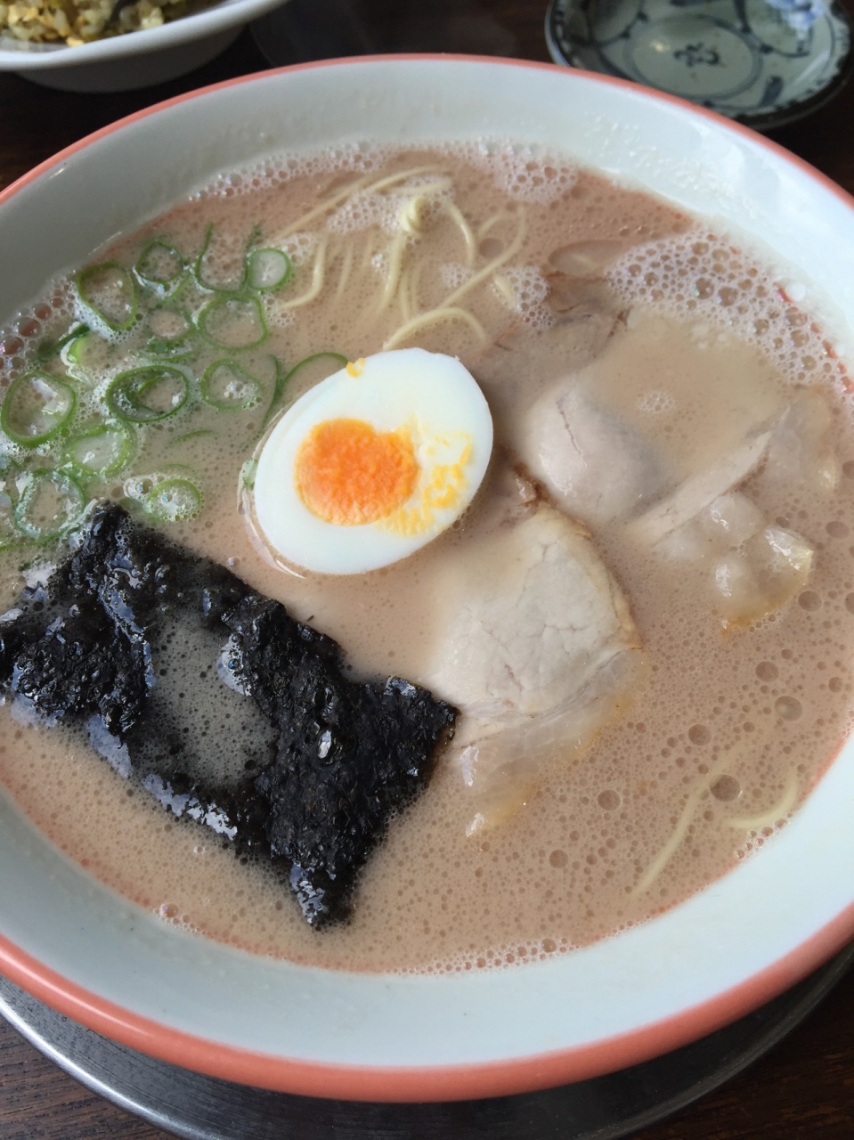 むかーし久留米で食べて、おいしくて。近くで用事があったので、行ってきました。13時過ぎていたので、週末でも待たずに入れました。家族連ればかりでした。ラーメン650円、替玉100円。煮卵とのり、ねぎ、チャーシューが入っていました。チャーシューもしっとりしていておいしかったです。