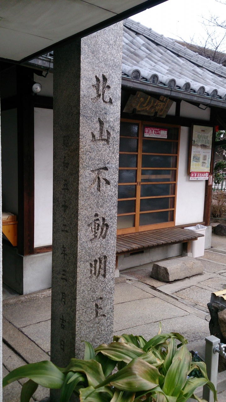 道路に面して3mはある巨大な石標があって「十三まいりの寺」と刻まれており、目に留まります。山門は鉄筋コンクリート造で仏教様式をベースにしていますが、現代的な要素も取り入れた、落ち着いた都会的なデザインです。境内に入ると筆塚、針塚など石碑が多数点在しています。また、境内の奥には北山不動明王があって、きりっとした顔つきで鎮座しています。こちらのお寺の「十三まいり」は子供から大人へ成長する13歳の時に虚空蔵菩薩にお参りをして智福をお祈りする行事で数百年にわたって続けられている行事です。