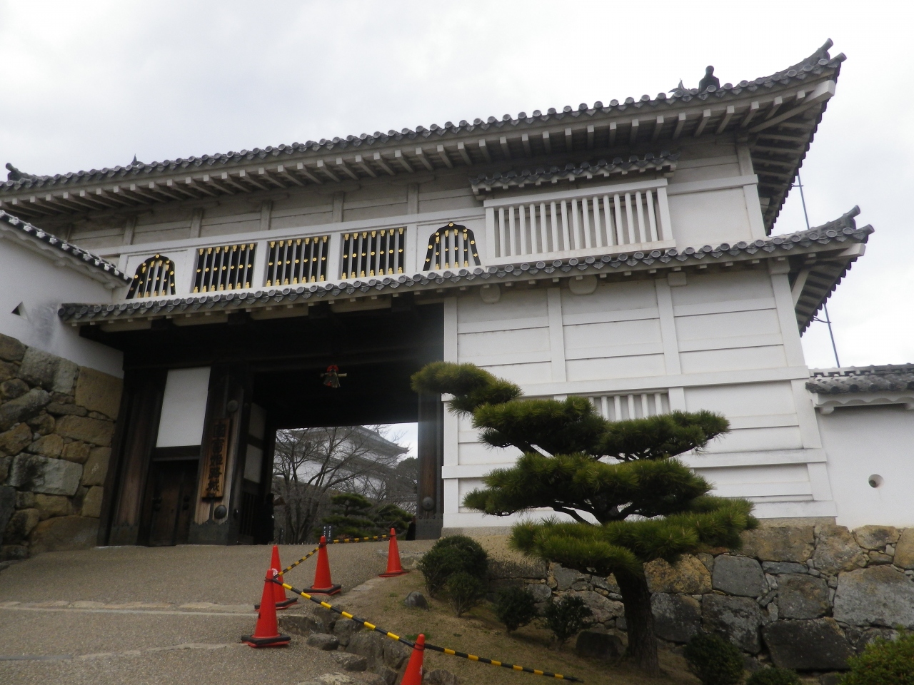 世界文化遺産・国宝の姫路城、入場ゲートを入ると最初にある大きな門が菱の門です、表玄関にふさわしい格式のある櫓門、片側だけ石垣に乗る珍しい安土桃山様式の城門、冠木に木彫りの菱の紋があることから名前が付けられたようです、ここからいの門、ろの門へ行けます。