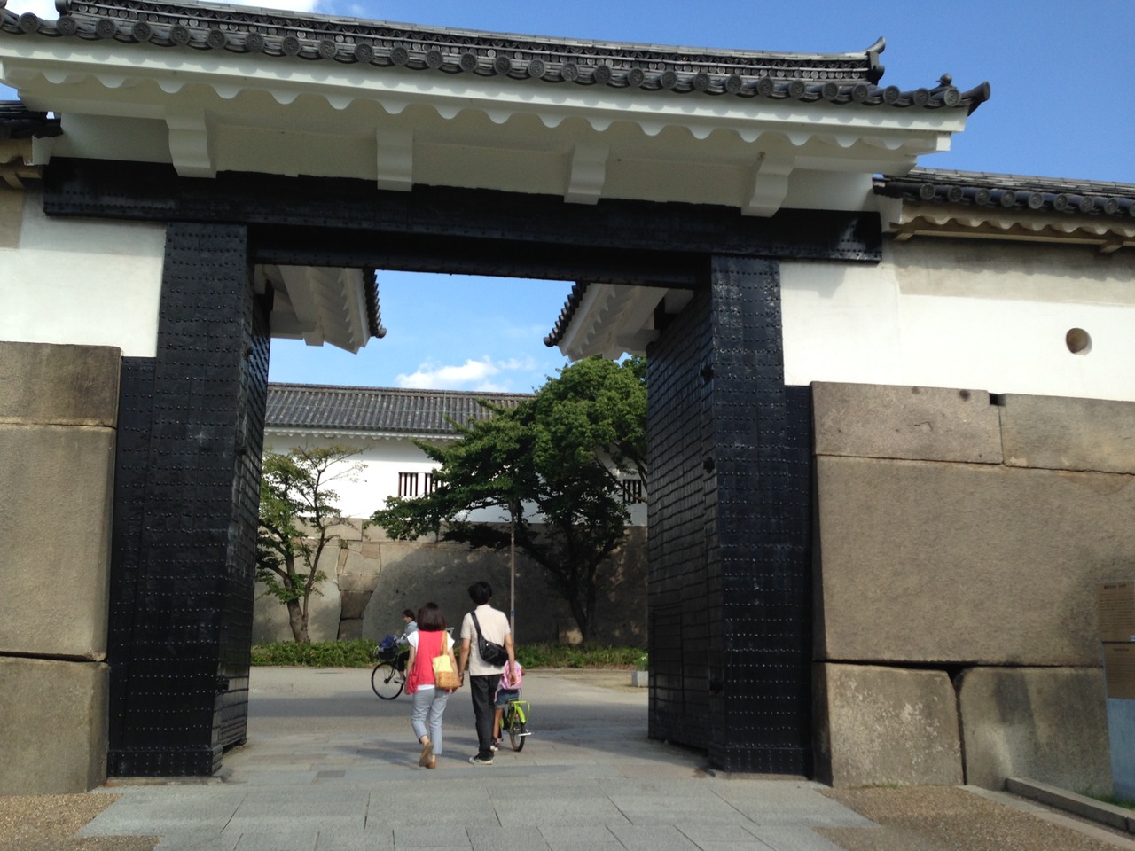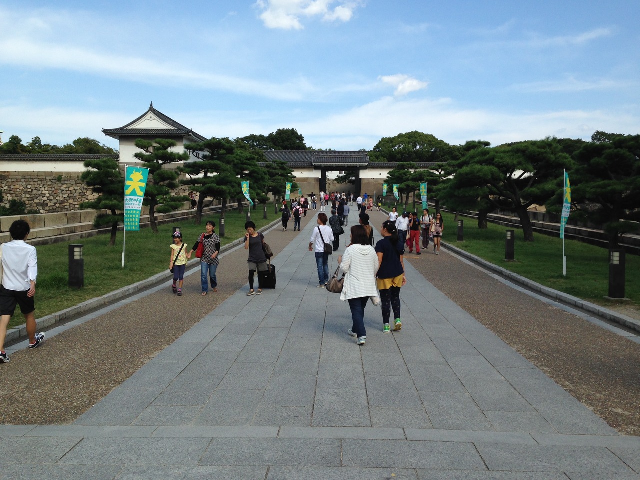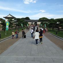 大手口より高石垣の幅広く深い堀に挟まれた通路を通る。目の前の大手門には威圧感があり、また、通路から眺める堀にも圧倒される。