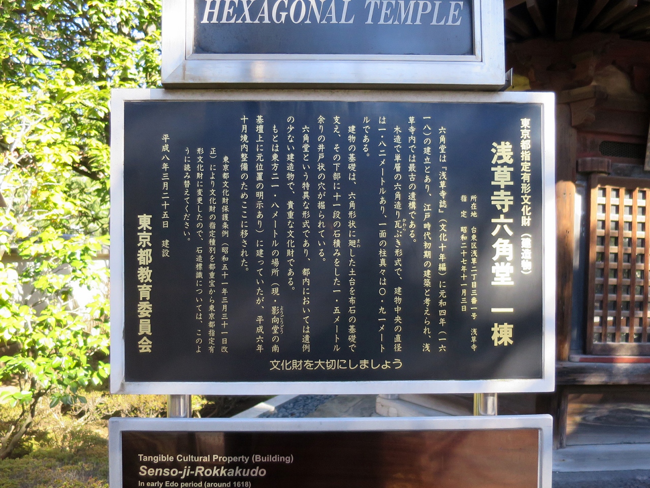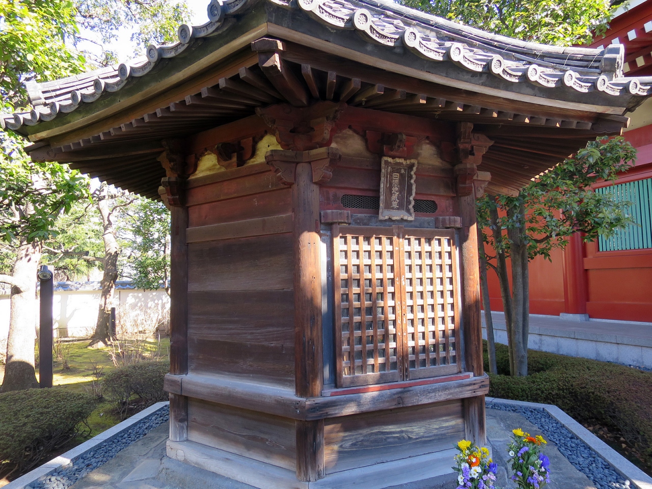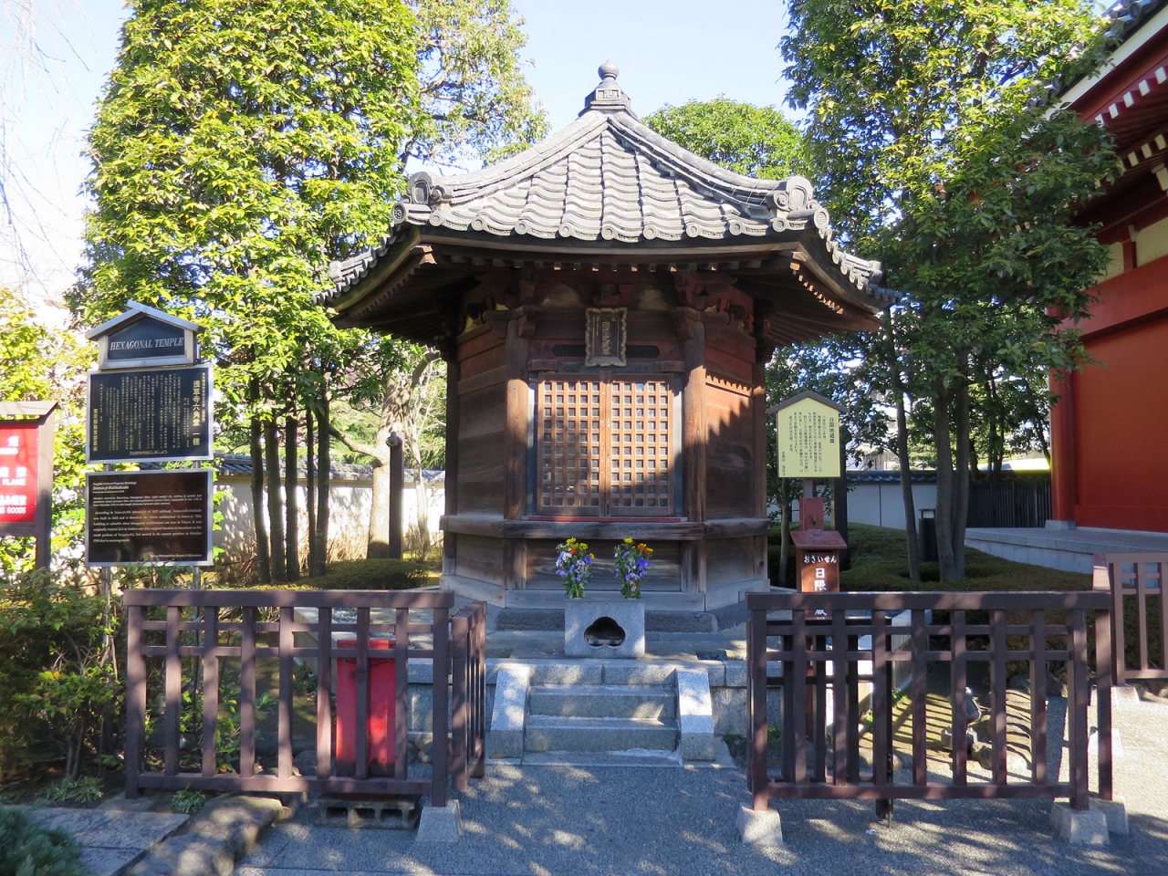 「影向堂」の北西(「雷門」から見れば左奥)に建つ、六角形の小さなお堂です。1618年建立と伝えられていて、「浅草寺」はもちろん、都内でも最古の木造建築ということですが、由来はよく分かりません。ただ堂内には日限地蔵尊が安置されているとのことですから、神仏習合という日本独自のいいかげんな?寛容な?…いや、素朴な信仰心を感じられますし、お堂そのものからも素朴さが伝わって来ます。