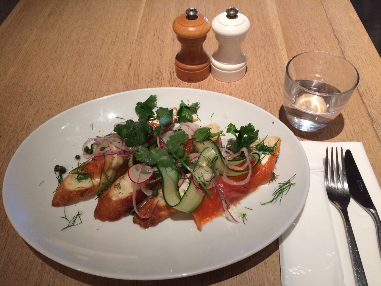 結局、「グラブラックスサーモン、ディル、 クリームチーズのクロスティーニ」(税込で\1,296)というオープンサンドをいただきました。美味しかったです!