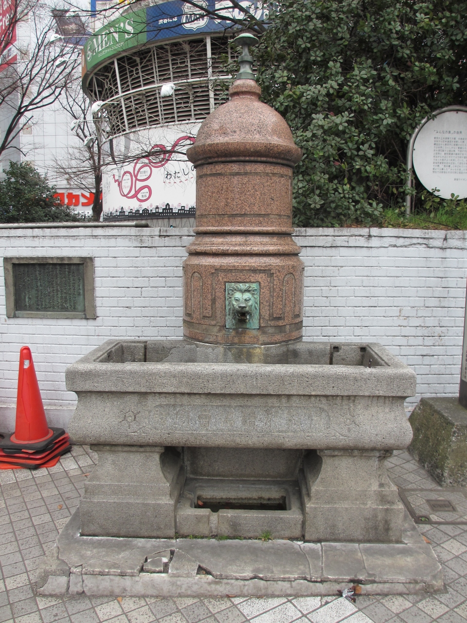 新宿駅前東口広場にひっそりと立っています。東京下水道育ての親、中島博士が明治34年、ロンドン水槽協会から寄贈された水飲み場です。赤大理石製で、上部は馬用、下部は犬猫用、裏には人間用の水飲み場が造られています。昭和39年に今の地に移転して以来、みんなの泉と呼ばれています。世界に3つない貴重なものですが、馬水槽に気が付く人はほとんどいません。