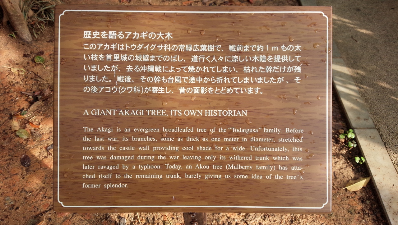 首里城公園にはいくつかのパワースポットと言われるところがあります。今日はあまり知られていないところで「歴史を語るアカギの大木」をご紹介いたします。正殿の出口である久慶門の通りを隔てたところにあります。もともと首里城を囲むようにアカギの大木が茂っていたようですが、戦火を経ていまではほとんど残っていないそうです。首里城に行かれたら寄ってみてください。