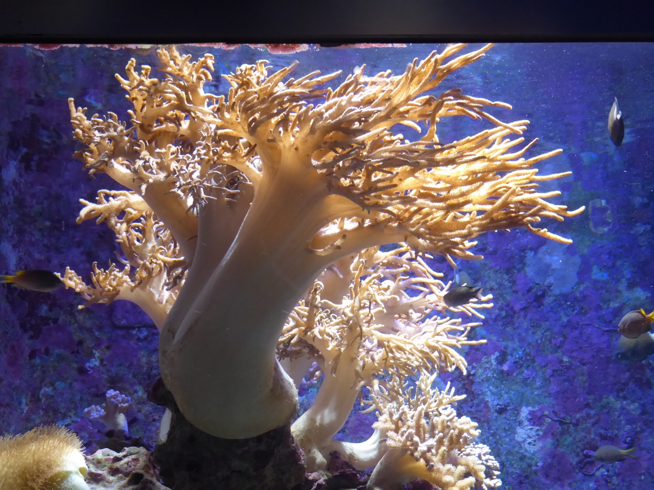 薄暗いアクアリウムのような感じだが、巨大水槽のガラスの横の席もある。