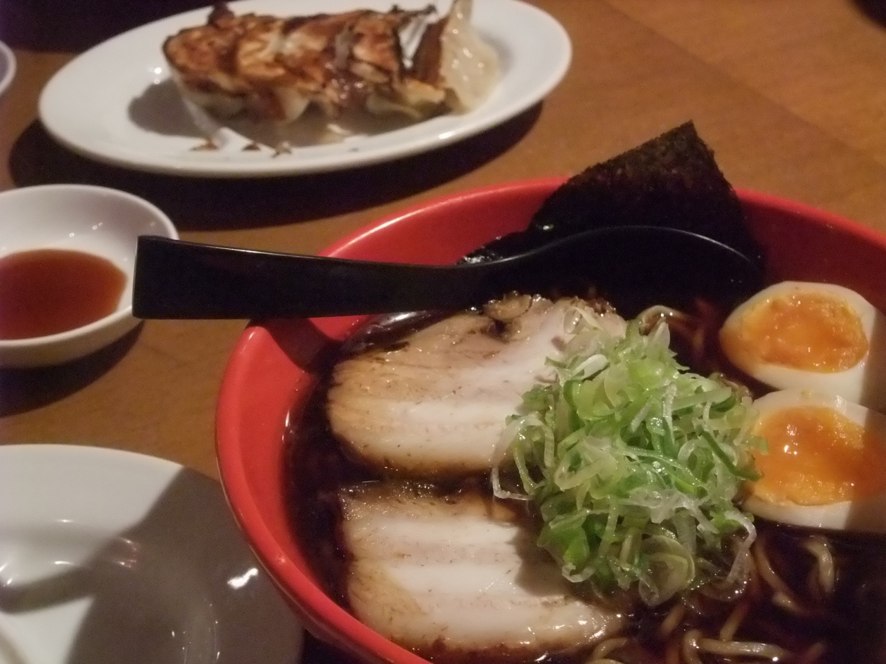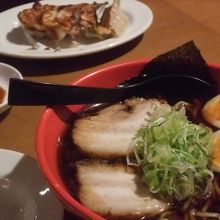 味玉ブラックラーメンと富山白エビラーメンを注文。ネットで見つけた餃子無料クーポン2枚で一人一皿いただけました。