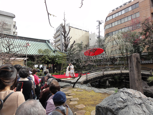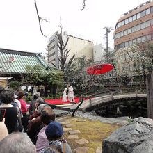 バスツアーで行きました。梅は3分咲きでしたが、境内は受験シーズンと重なり賑やかでした。食べ物屋台の他、地方の物産、東大アニメサークルの方に似顔絵を書いてもらうコーナー、梅の盆栽展示、琵琶の弾き語りや講談も見ることが出来ました。狭いところに300本の梅が植えられているそうですが梅より、人を見た感じでした。