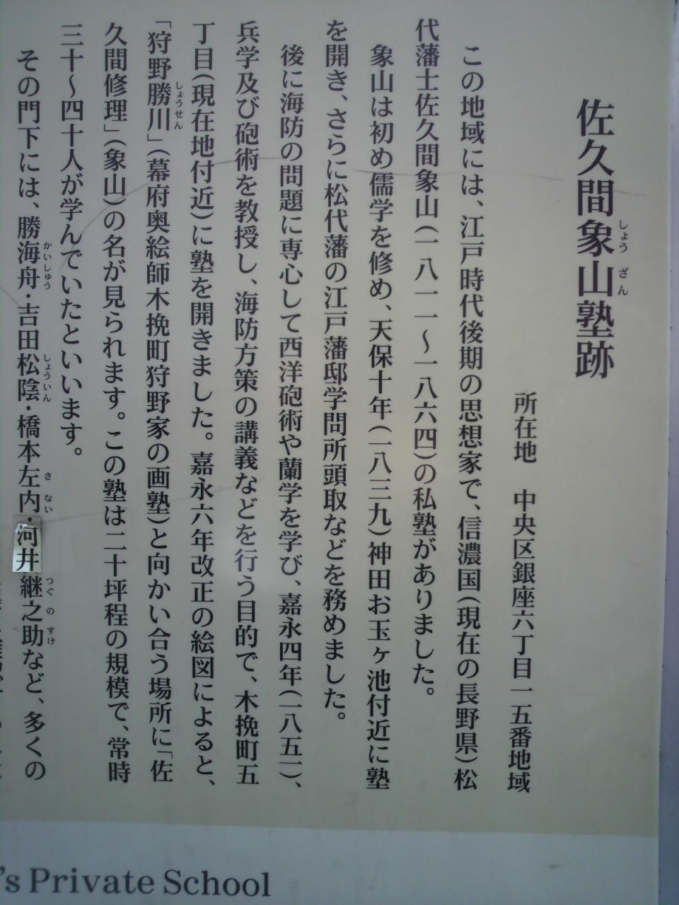 佐久間象山は、海防の方策に専心し、兵学及び砲術を教授し、海防方策の講義などを行うため、木挽町に塾を開きました。