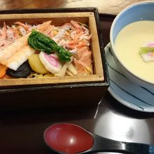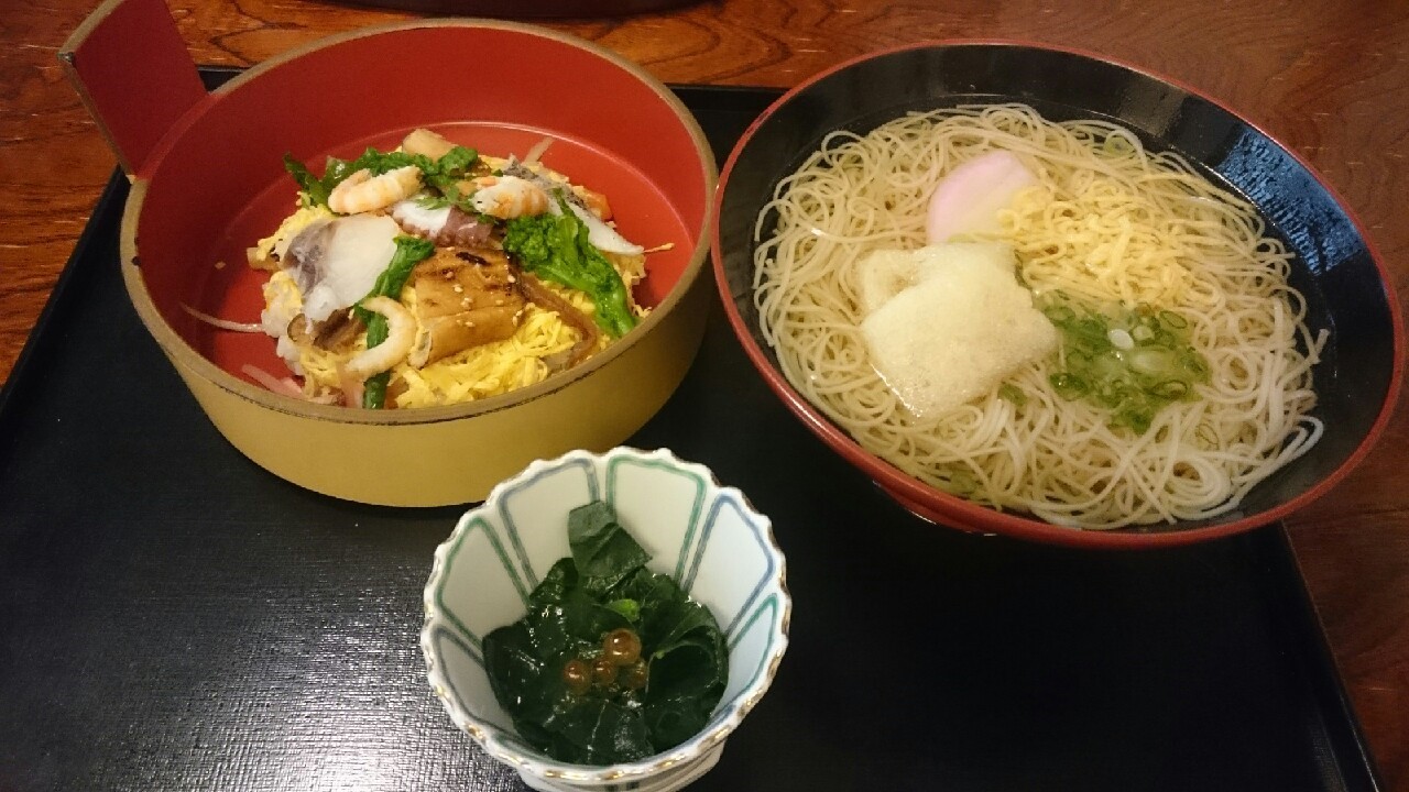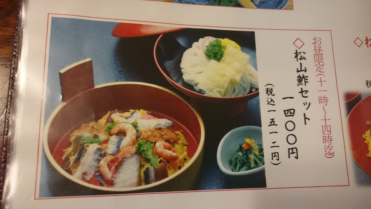 電停の大街道駅からアーケード街に入り、証券会社の角を左に曲がったところにあります。お寿司屋さんですが、店も広く、郷土料理が充実しています。ランチタイムに訪問し、松山鮓セットとぬく寿司セットを注文。松山鮓はだいたい予想どおり。ぬく寿司が見た目よりボリュームがあり、名前のとおり温々で美味しかったです。