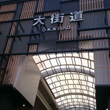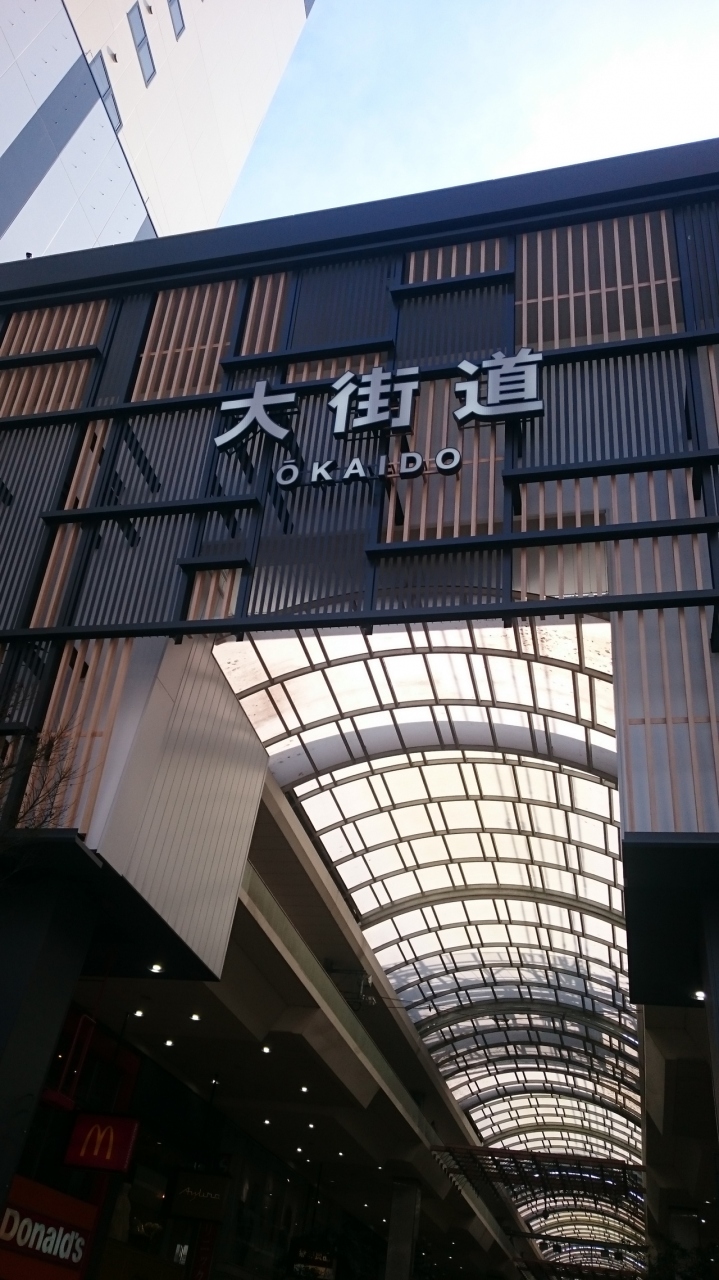 空港からのバスで行くと、一番町のバス停で降りて、通りを渡った反対側にあります。角に三越があるので、すぐわかります。ここは松山の繁華街で、アーケードの両側にいろいろな店があります。道幅がとても広く、人がたくさん来ても大丈夫という感じです。自転車は禁止で、通行や駐輪を注意する赤いジャンパーを着た監視員の女性がたくさんいます。