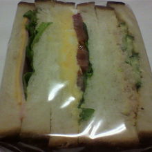 「ミックスサンド」345円(税込)を買いました。たまごサンド、ハムチーズサンド、ツナサンドの3種が1パックになっています。耳つきのままのスライスパンはもちっとしてます。食べやすいシンプルなサンドイッチ。