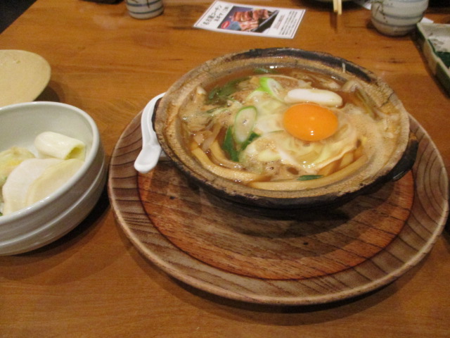 栄から伏見方面へ、夜の街歩きし途中で角に明るいお店。雨なので早く雨宿りしようと入ったら有名な山本屋なので嬉しくなりました。中は綺麗で清潔、客が次第に増えてほどんど満席状態。夕食の時間を過ぎているので、名古屋の人は〆に煮込みうどんを食べるのかな?と。夕食後だったので、アルコールと煮込みウドンは一つ頼んでシェア。とても丁寧な接客。お酒のつまみ?に漬物は白菜と大根(白い沢庵)のお代わりでき、白しょうゆをかけて頂くのがさっぱりと美味しかったです。