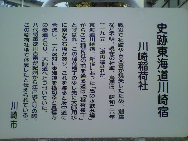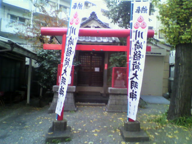 古くから川崎新宿のお稲荷さんとして信仰を集めていたそうです。戦災で社殿や古文書が焼失したので創建は不明で、現在の社殿は昭和26年(1951年)ごろに、戦前の建物を模して再建されたものだそうです。小さいけれど、キレイに管理されているお稲荷様でした。