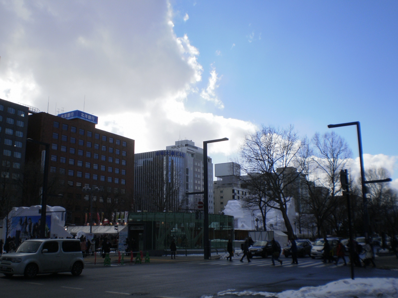 2016年のさっぽろ雪まつりを観に行きました。 車いすを押していたのでなるべく外を歩かないように、札幌駅北口でバスをおりて、地下歩行空間チカホを通って、ビッセのエレベータで地上にあがりました。会場内は人通りが多いし道が雪でザクザクしていたし、車いすから眺めても人通り多すぎるので、ひとつ向かい側の歩道から会場を眺めました。