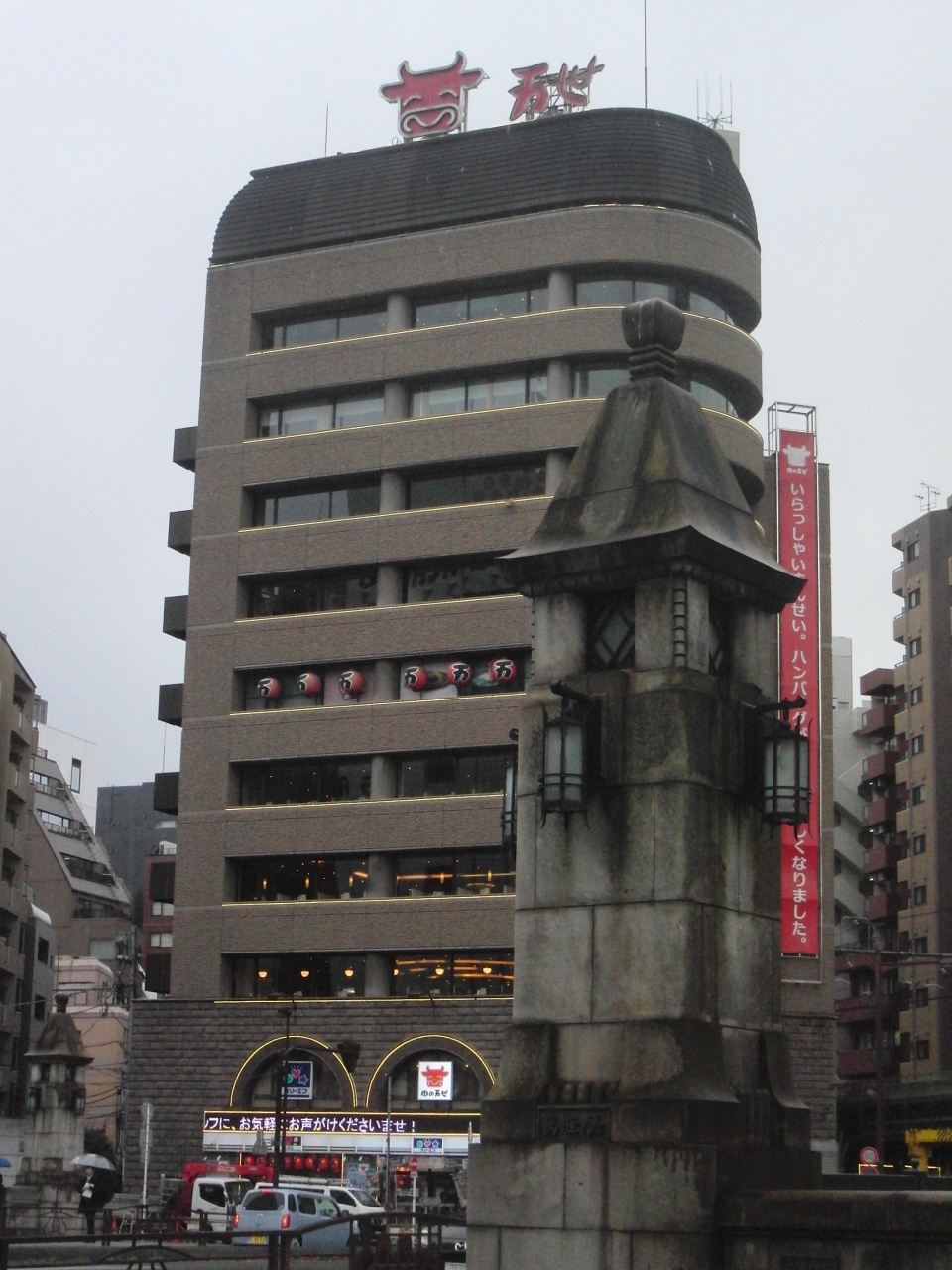 橋と「肉の万世」ビルを一緒に撮影してみました。