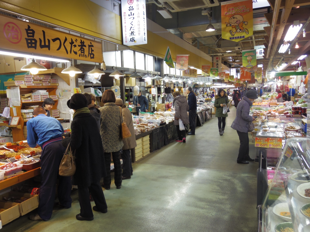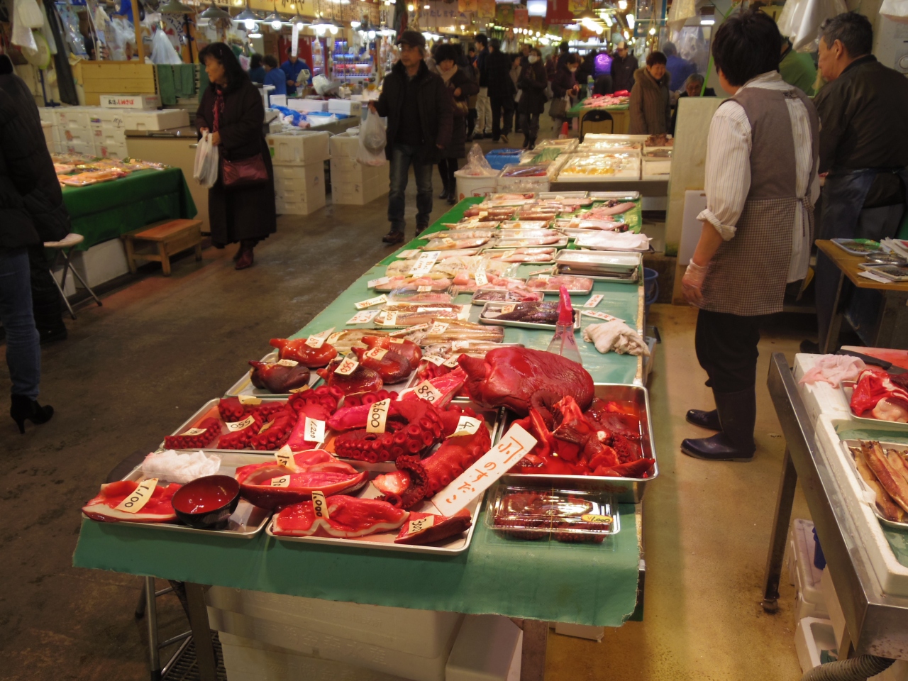 年末に行ったが、お正月の用意の人でごったがえっていた。県外から来た僕は、物珍しいものが多かった。長い根のセリが売られていたが、尾の長い根を食べるんのだと聞いてびっくりした。少し崩れた明太子とか、未処理のイクラなど、昔の市場を彷彿させる。老舗の漬物店などでは、地元の人が買っていて凄い混み方だった。広場では、エンターテーメントが行われ、一寸したスパーの様なメニューもある。