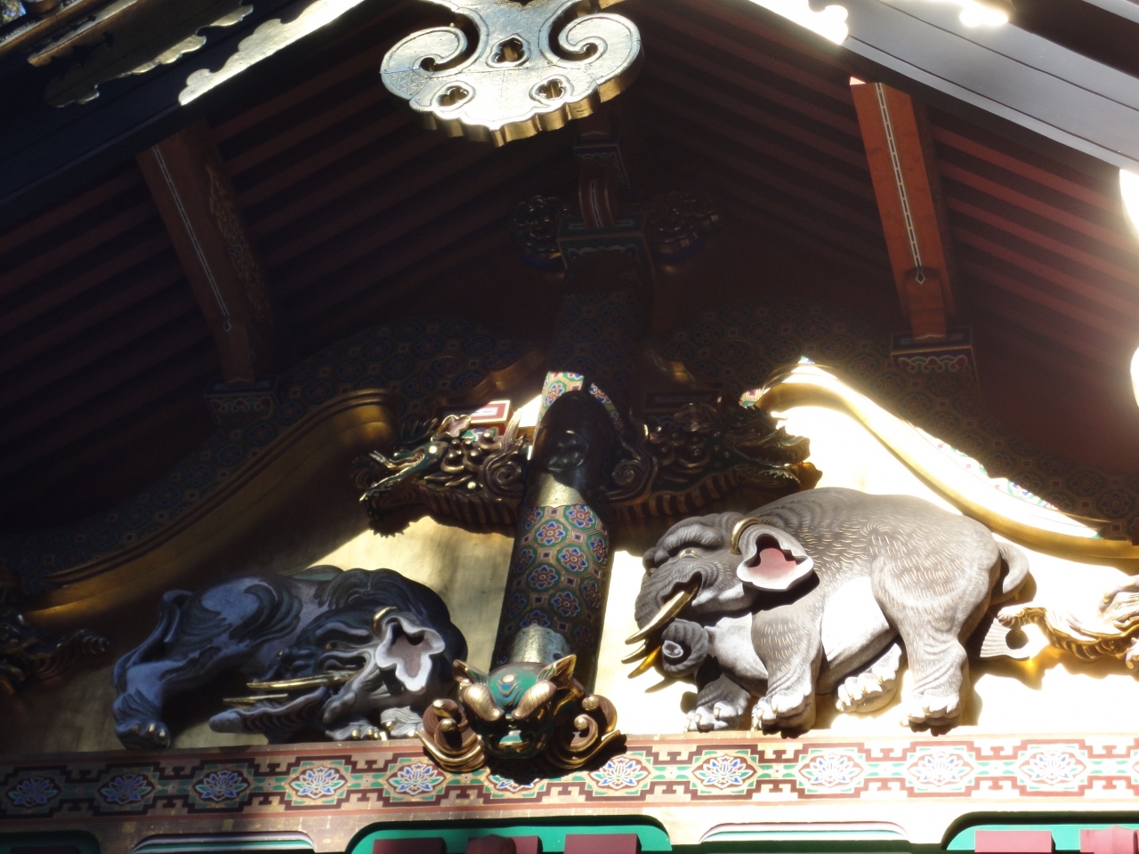 三神庫という例祭で使われる品物が収められている倉ですが、そのうちのひとつ上神庫には二頭の象の彫刻があります。