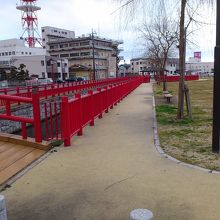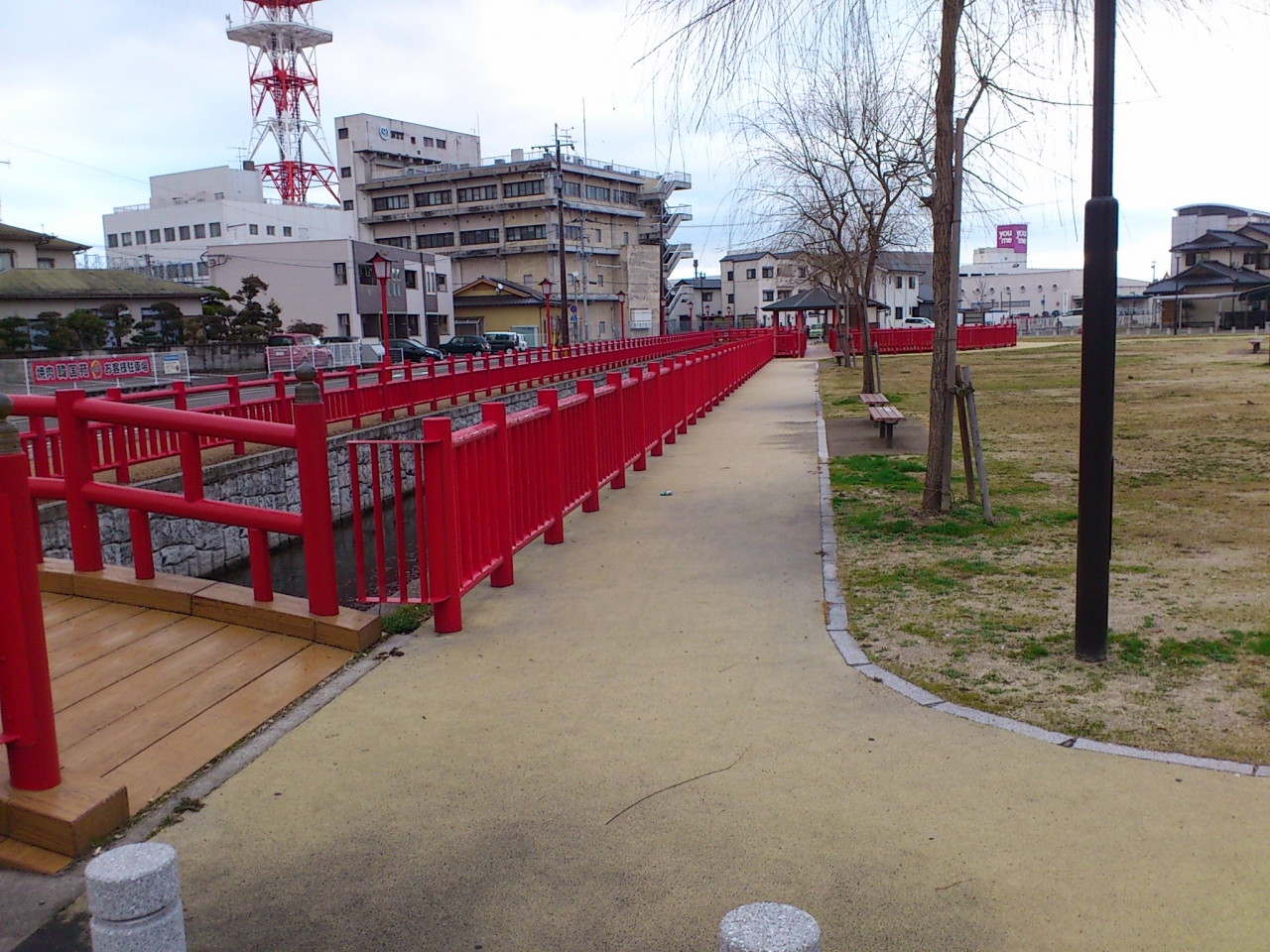 中津駅から中津城まで歩いて行く途中の寺町と言うお寺がたくさん有る地区がありますが、そこへ辿り着く前に鮮やかな朱色の欄干が長く続く場所があったので、寄って見ました。名前の通りの金剛川という名の川の周辺を公園として整備したものです。とにかく朱色が鮮やかです。