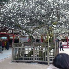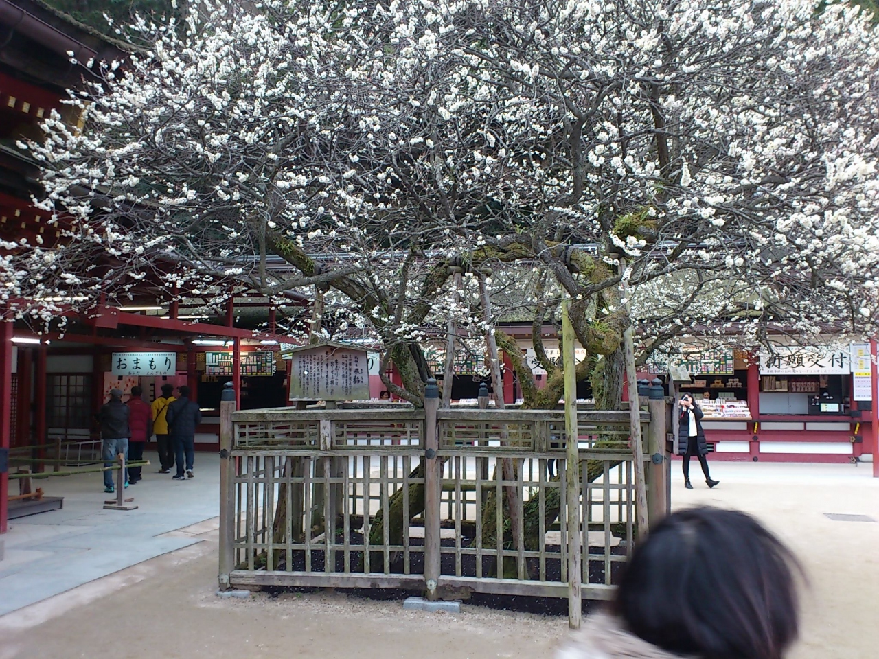 天満宮の御本殿の右手前のところにある梅の木です。樹齢は千年を超えているそうです。御神木なので、木の周りは柵で囲われています。樹齢千年と言われるほど大きな木ではありませんが、2月中旬に訪れた時には白い花をきれいに咲かせていました。天満宮のなかにある梅のなかで一番最初に咲き始めるそうで、確かに他の梅の木は咲いていないか、咲いていても花が咲き始めの状態でした。