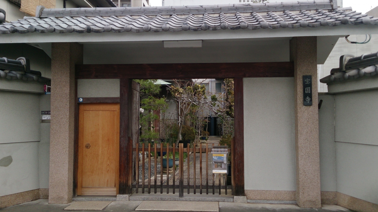 大阪府内でも一大寺町となっている、上町台地の西側の夕陽ヶ丘、谷町エリアにあって、特に寺院が集中している夕陽ヶ丘学園高校の北側地区にこの寺院は建っています。大阪の中心地区に位置しているものの、そのような街なので都心の喧騒とは隔絶されたような空間になっています。訪問したのが土曜日の午前中でしたが人通りも、参拝者もなくひっそりとしていました。この界隈の山門はそのほとんどが木造の伝統的な仏教様式の物で、瓦屋根を持ったものですが、こちらは、この界隈では珍しく鉄筋コンクリート造のもので、瓦屋根になっているものの、柱は薄いあずき色、それ以外の部分は茶色と白色で寺院の山門というよりは純和風旅館か料亭の門のような感じです。