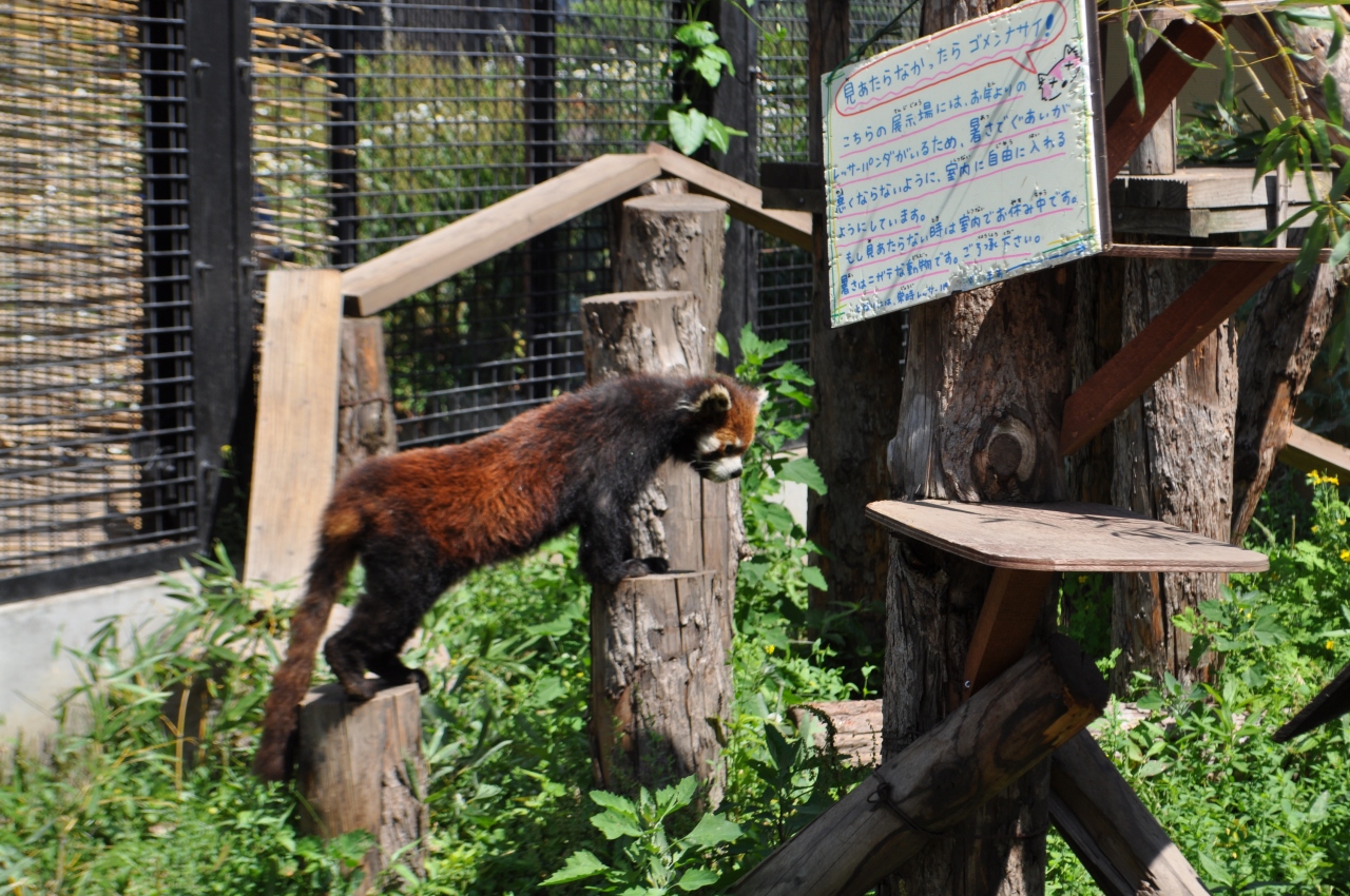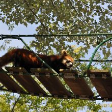 通路を挟んで吊り橋で結ばれており、そこをレッサーパンダが行き来する姿が見れるのが売りの施設ですが、訪れた時はレッサーパンダのうちの一頭があろうことがつり橋のど真ん中で昼寝をしており、通行止めになっていました。夏バテかしら?それはそれでとても可愛らしく、見てて面白かったです。また、とあるレッサーパンダが塀の上からジャンプして着地した先に別のレッサーパンダがいて、2頭で喧嘩になったりしてなかなか面白いものが見れました。