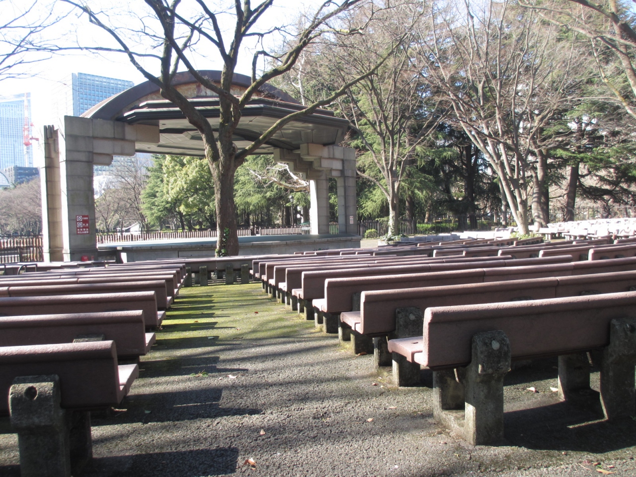 日比谷公園に中の音楽のための施設としては、「やおん」といわれる日比谷野外音楽堂が有名ですがその他にもこちらあの小音楽堂があります。両者の違いは大きさだけでなく、「やおん」では主にプロの興行が行われるのに対し、小音楽堂は入場料無料のコンサートでしか利用できない点です。出演者は、お金を払って会場を借り、無料で公演を行うことになります。小音楽堂ののキャパシティは1000人程度です。