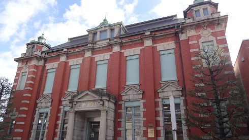 山町筋にある「富山銀行本店」です。通称は「赤レンガの銀行」と呼ばれ、大正時代の本格的な洋風建築としては富山県内唯一と言われています。旧 高岡共立銀行本店です。清水建設の田辺淳吉が設計し、辰野金吾が監修しました。鉄骨レンガ造りの2階建てで、外壁は赤レンガ、屋根の尖塔は緑青の銅板葺きです。