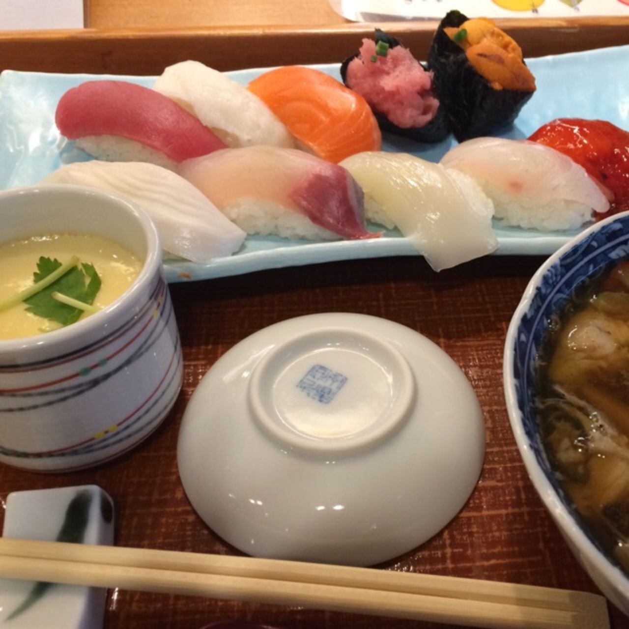 今回はランチでお邪魔しました。お店は時計台のすぐそばのビルの地下のようなところにあります。回らない方の花まるです。値段は忘れてしまいましたが、ランチセットで、握り、汁物、茶碗蒸のセットでした。ランチの時間帯でもお客さんは多くお店は忙しそうです。