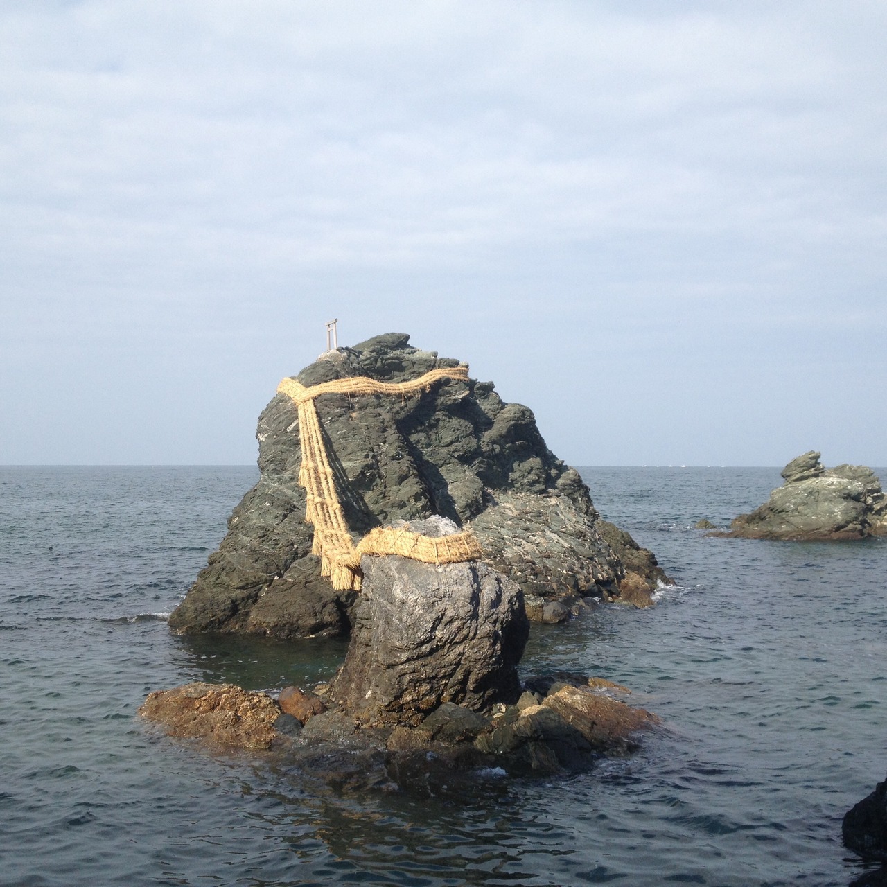 二見浦にある二見興玉神社のシンボルです。岩場の参道べりを通ると神社南側にあります。海と夫婦岩がマッチしていて御利益満点の雰囲気です。