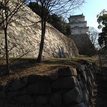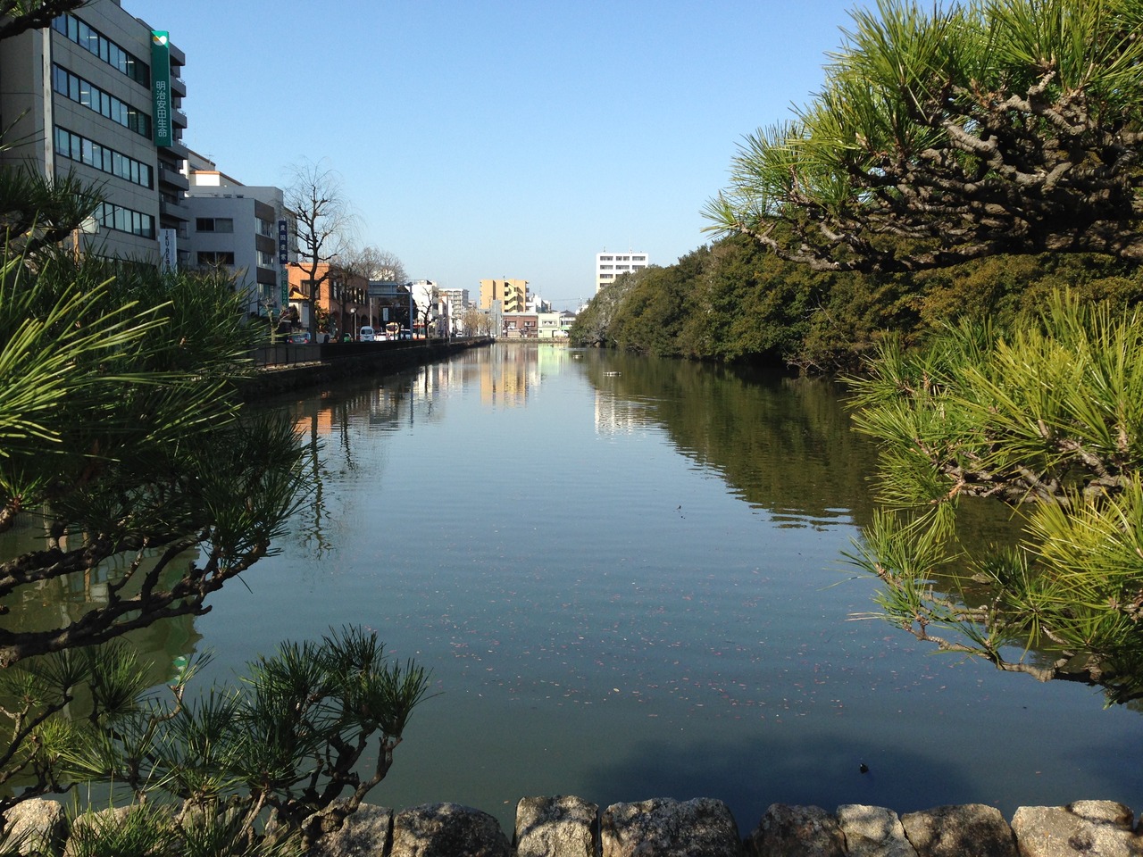 堀の水面の位置は、豪雨の時には溢れ出るのではないかと思われぐらい、道路の位置との高さと、さほど変わらない浅い堀。しかも、城内側の堀の石垣の高さもあまりない。
