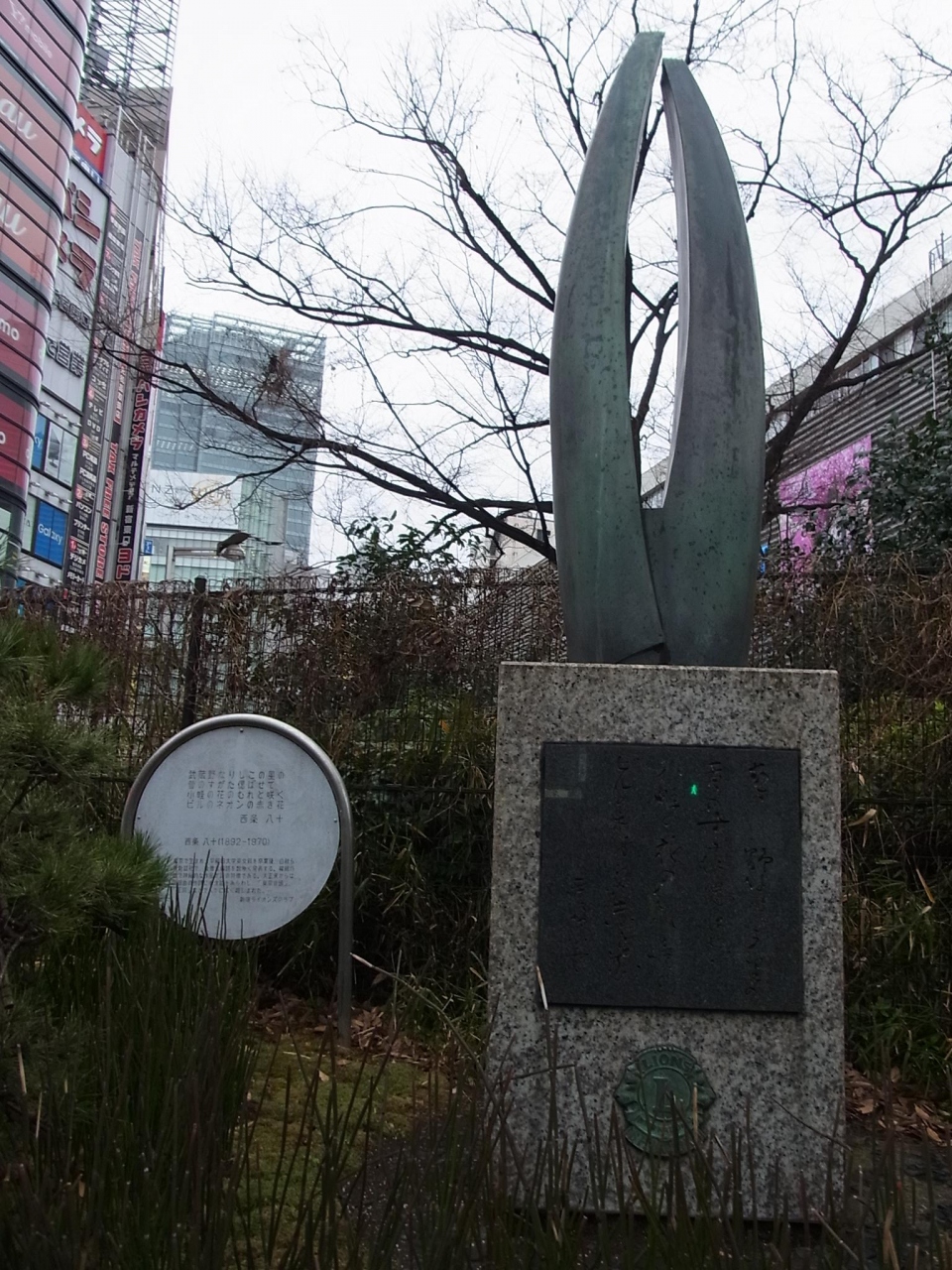 新宿東口のロータリー脇に西条八十詩碑とオブジェがあります。童謡詩人として有名で”ズイズイズッコロ橋”や”肩たたき”などが誰でもしっているのではないでしょうか。また、映画”人間の証明”でも八十の”ぼくの帽子”の詩から使われました。