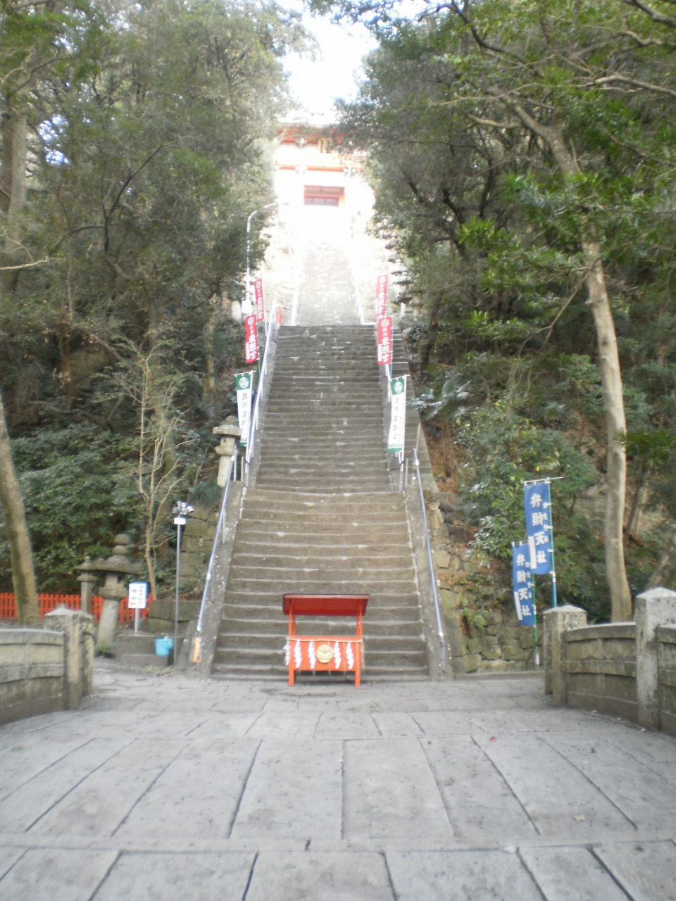 和歌山市内からホテルでかりたレンタカーで行きました。 自転車は駐車場の料金所の前に停めさせてくれました。 石の鳥居をくぐると樹木に囲まれた参道があって、目の前に急峻な石の階段がででーんとあります。 これをがんばって登ると立派な本殿があります。 境内から眺める和歌浦の景色はのどかな感じでで良かったです。