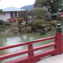 混雑した参道を抜け、御神牛を撫でてご利益を頂いた後、鳥居をくぐって太宰府天満宮の境内に入ります。太鼓橋を歩いて心字池を越えて行きます。心字池はその名の通り、心という字の形をした池です。太鼓橋を渡る事で身を清めてから、本殿に向かいます。