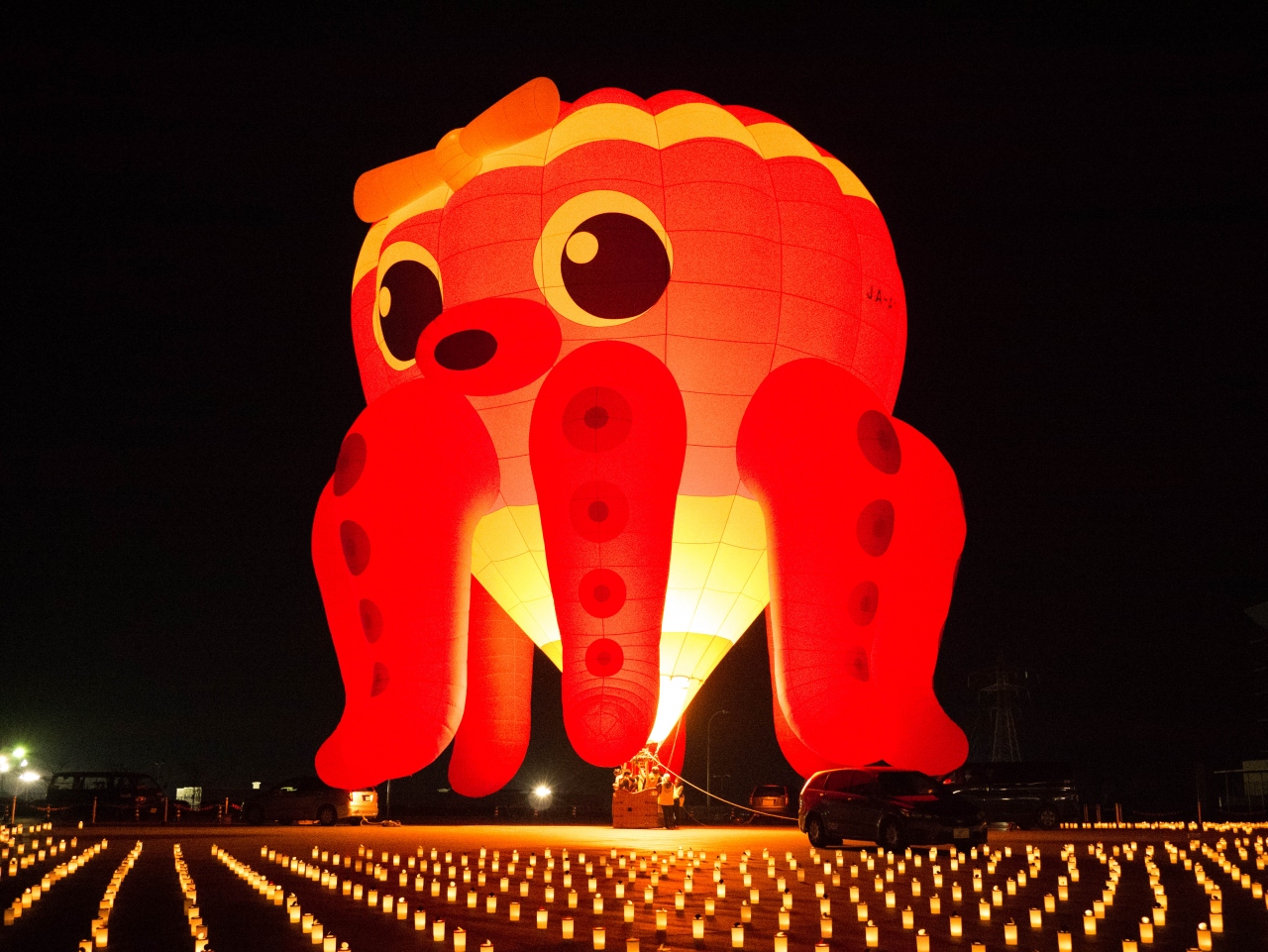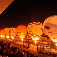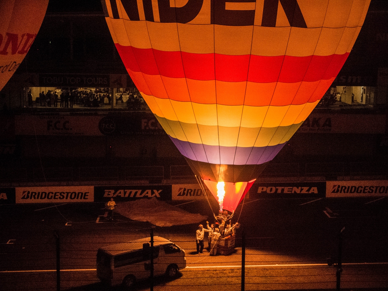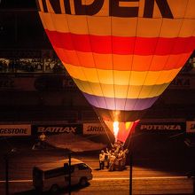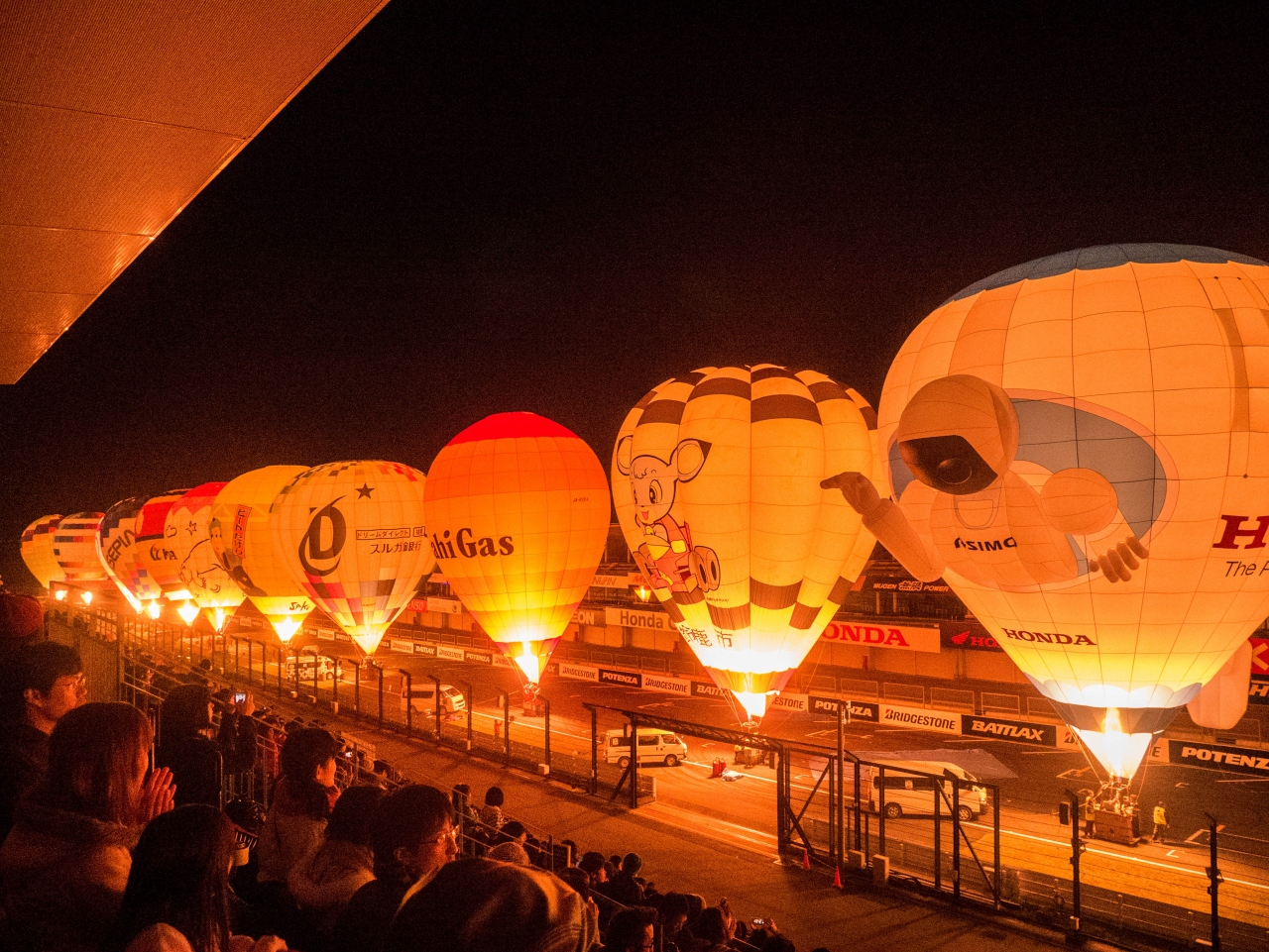 鈴鹿サーキットで行われる夜のバルーンイベント「バルーンイリュージョン」に行きました。普段はF1が走るレーシングコースに熱気球がズラリと並び、音楽と、MCの「バーナーズオーン!!」という掛け声に合わせて熱気球がライトアップします。