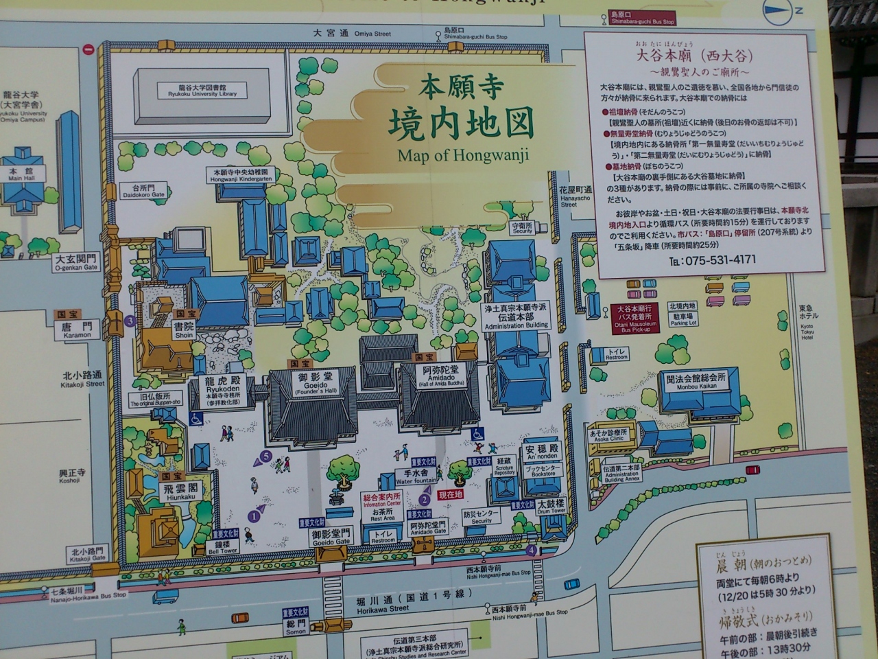 浄土真宗本願寺派の本山です。京都観光のため、京都駅の近くのアパホテルに宿泊。チェックアウト前の朝の散歩がてらにこの西本願寺に歩いて来ました。徒歩で10分ほどです。本堂・御影堂の大伽藍が並び築地塀をめぐらした大寺院です。無料で参詣できます。