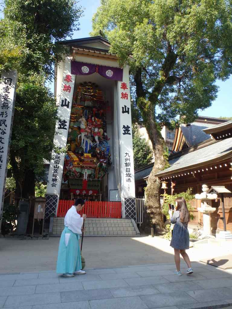 7月の山笠祭りで有名。境内に大きな飾り山笠もデンとあった。案内板では「社伝によれば、天平宝字元年(757年)の創建。。。古くから博多津中の鎮守として崇敬を集めてきました」などとあり、北部九州の歴史、伝統を感じることもできる。最近の傾向のせいなのか、英語、韓国語、中国語の説明もあった。